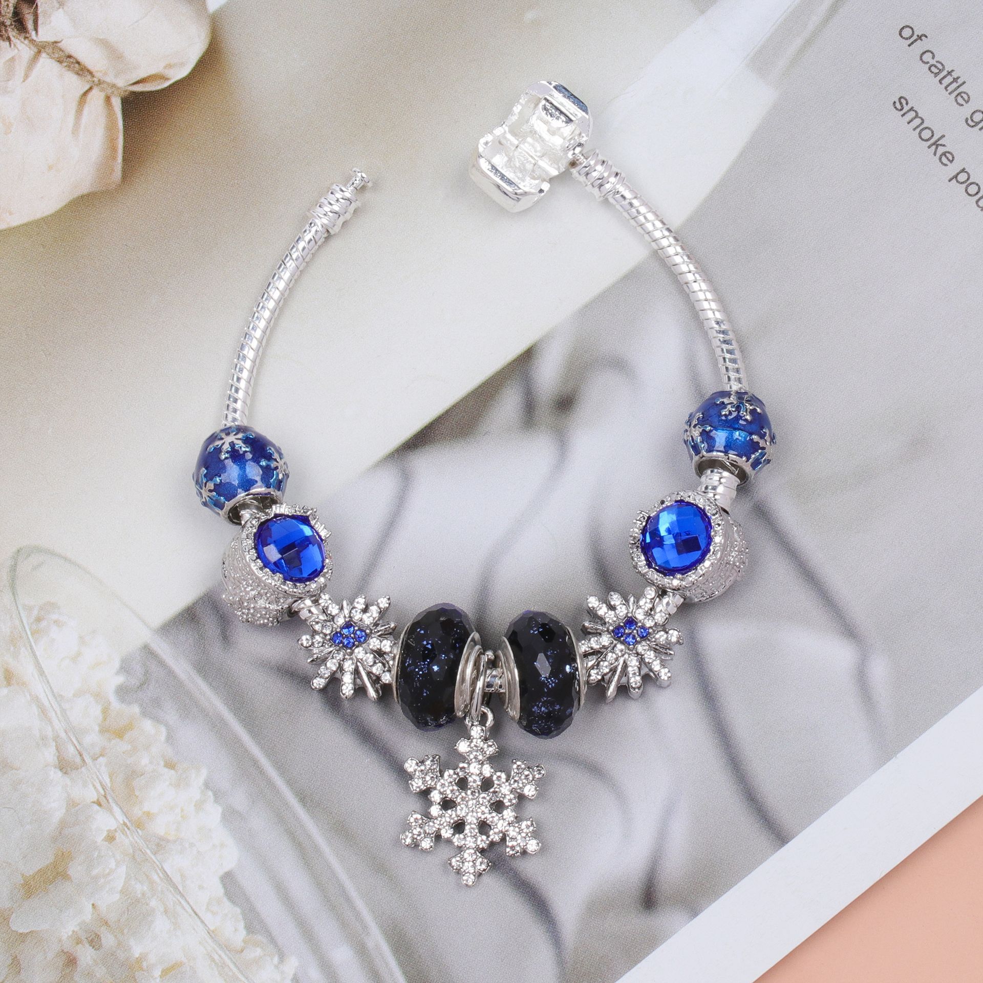 欧美潘家蓝色切面猫眼石琉璃珠串珠手链 diy镶钻合金雪花吊坠手串