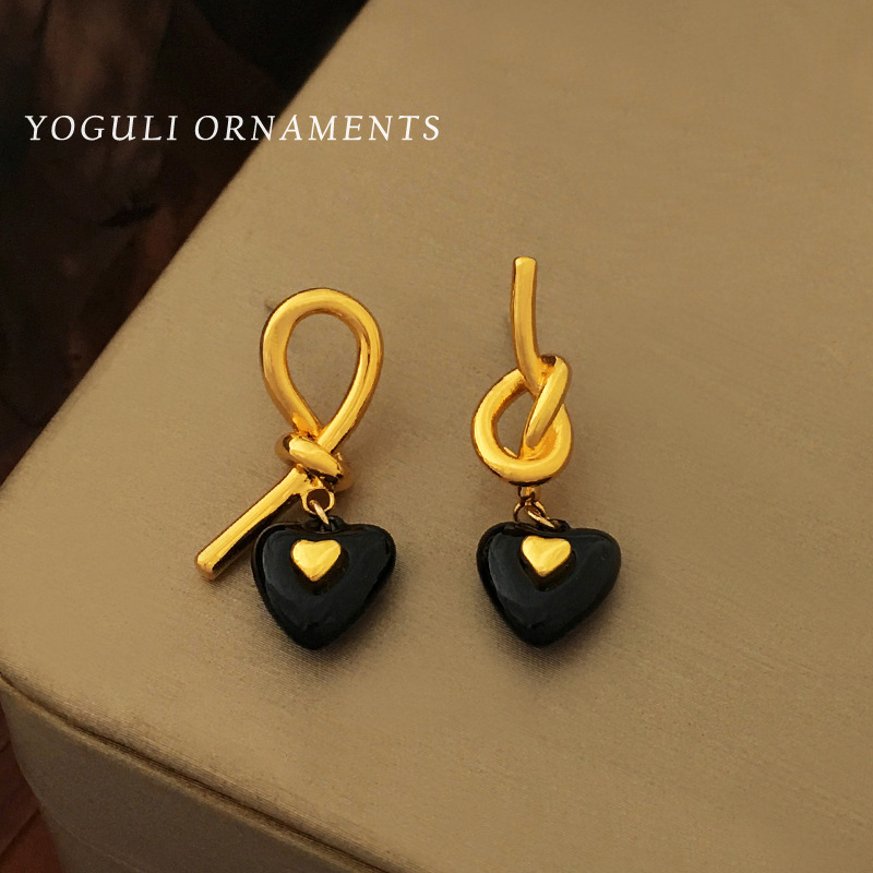 S925银针法式高级感黑色爱心耳钉气质小众不对称绳结设计耳环1893