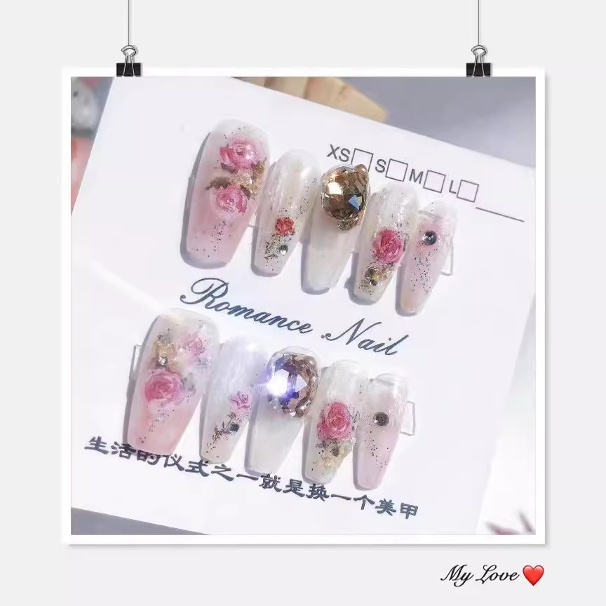 网红爆款春日水彩玫瑰浮雕美甲贴纸气质仙女风爆闪显白穿戴甲持久