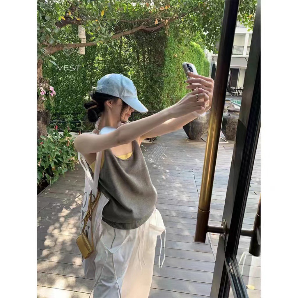 辣妹小众针织灰色吊带背心女装夏季宽松休闲设计感大露背上衣