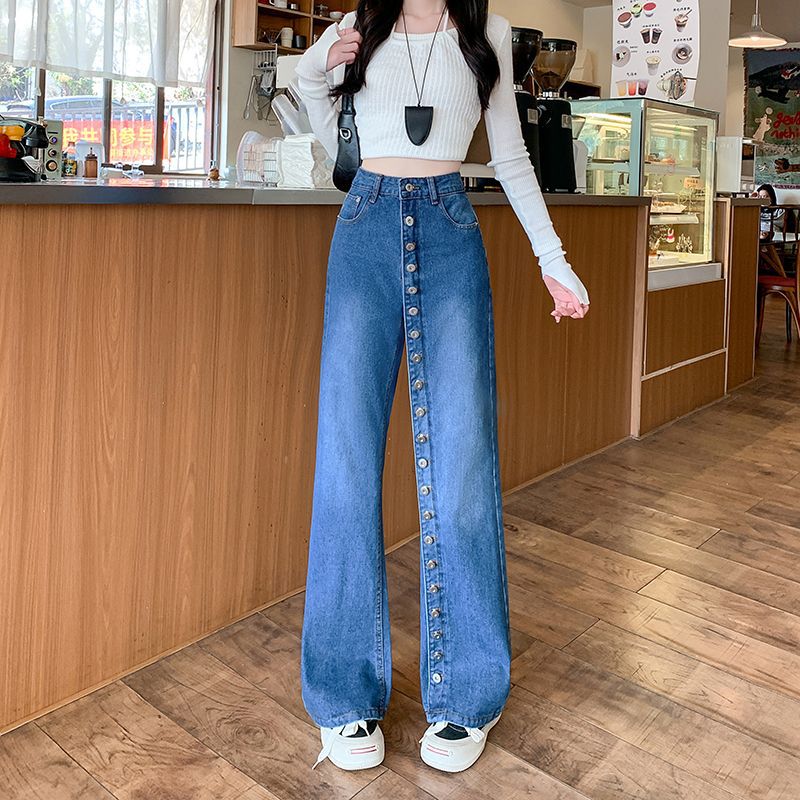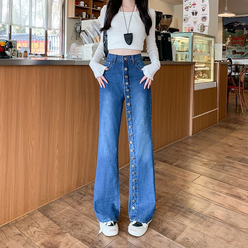 实拍实价~美式复古多纽扣直筒牛仔裤女个性显瘦高腰重工阔腿长裤