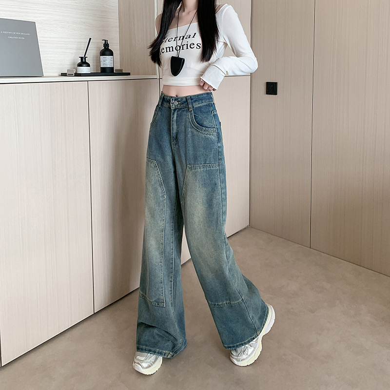 实拍实价~复古牛仔裤女2025春季新款美式水洗做旧宽松牛仔长裤子