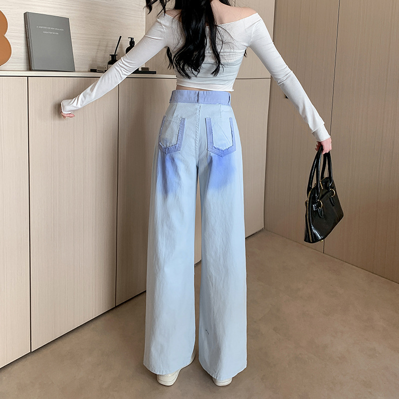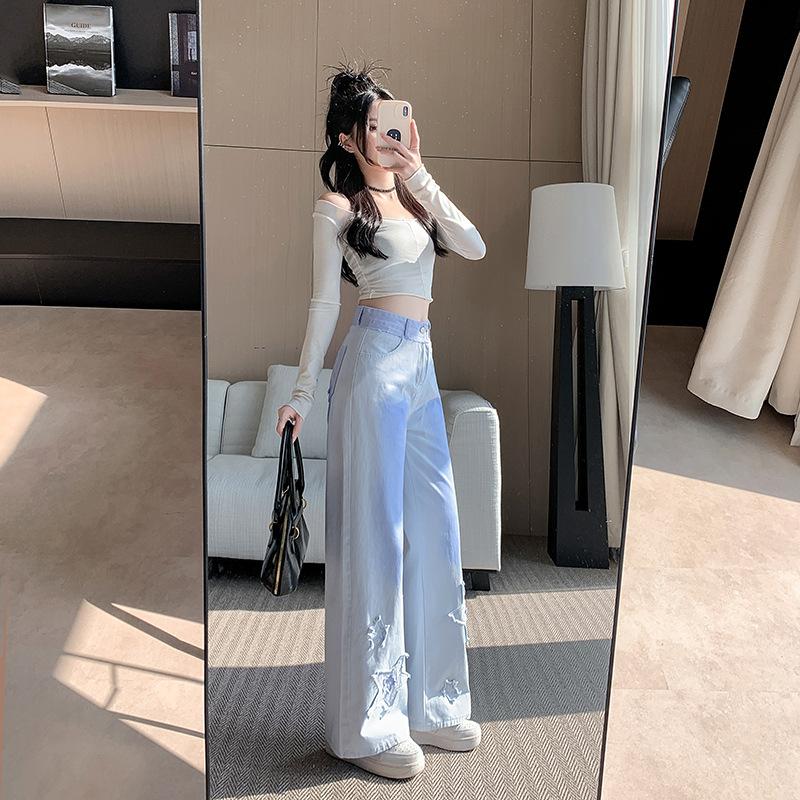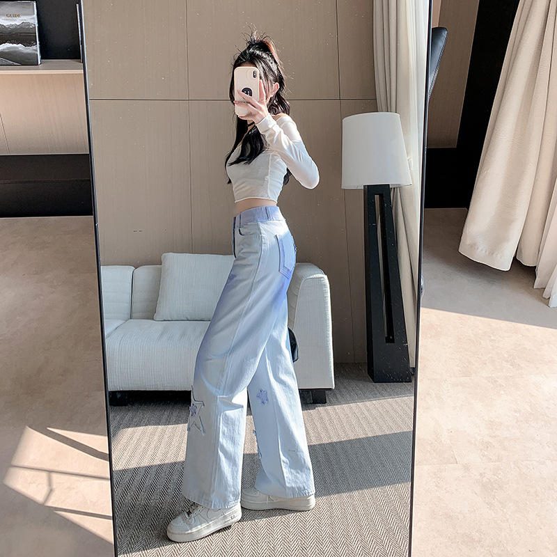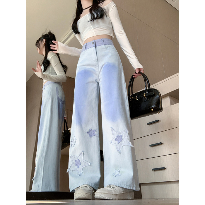 实拍实价~星星贴布渐变牛仔裤女春秋季新款宽松直筒阔腿拖地裤子