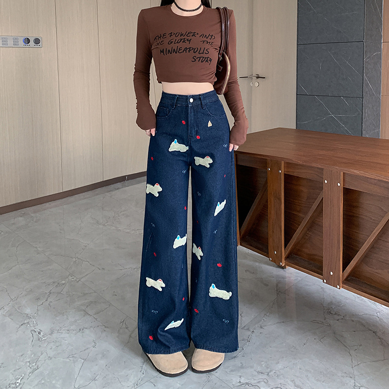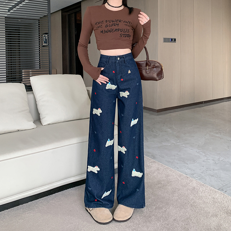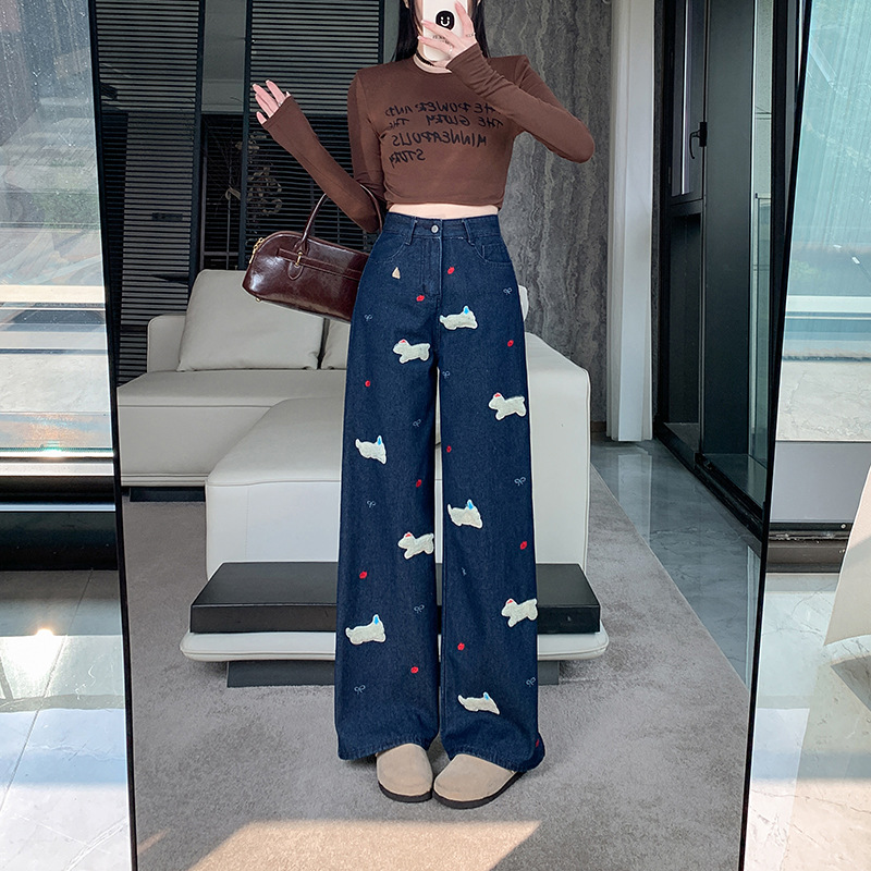 实拍实价~小狗刺绣牛仔裤女秋冬新款直筒高腰慵懒松弛感牛仔裤子