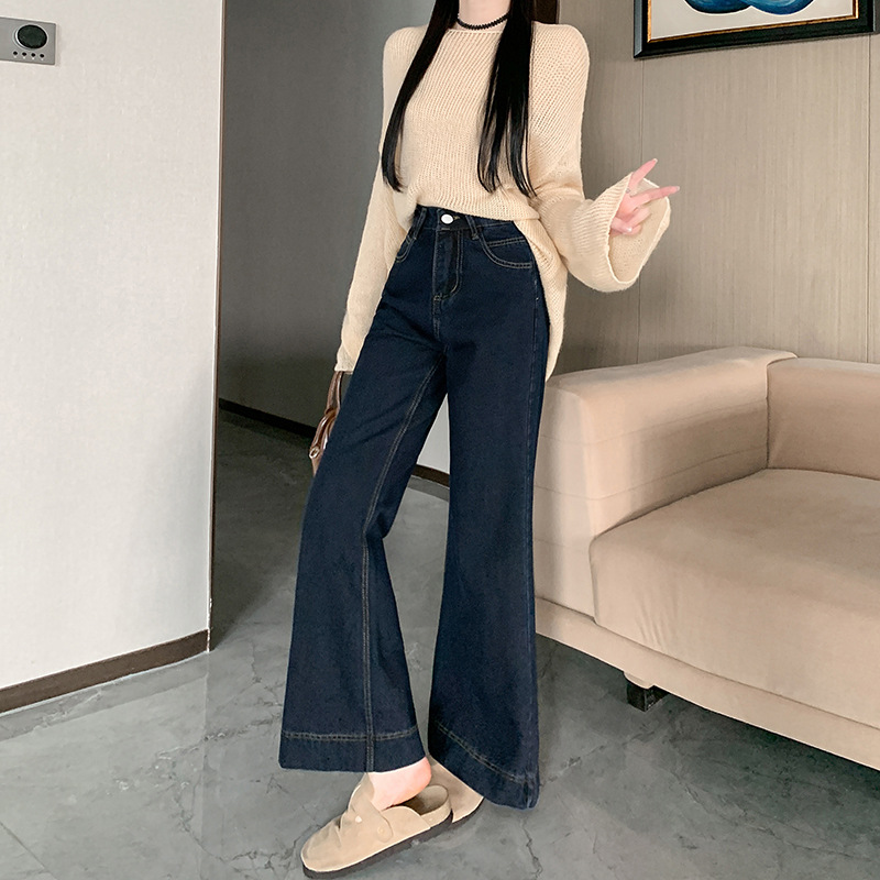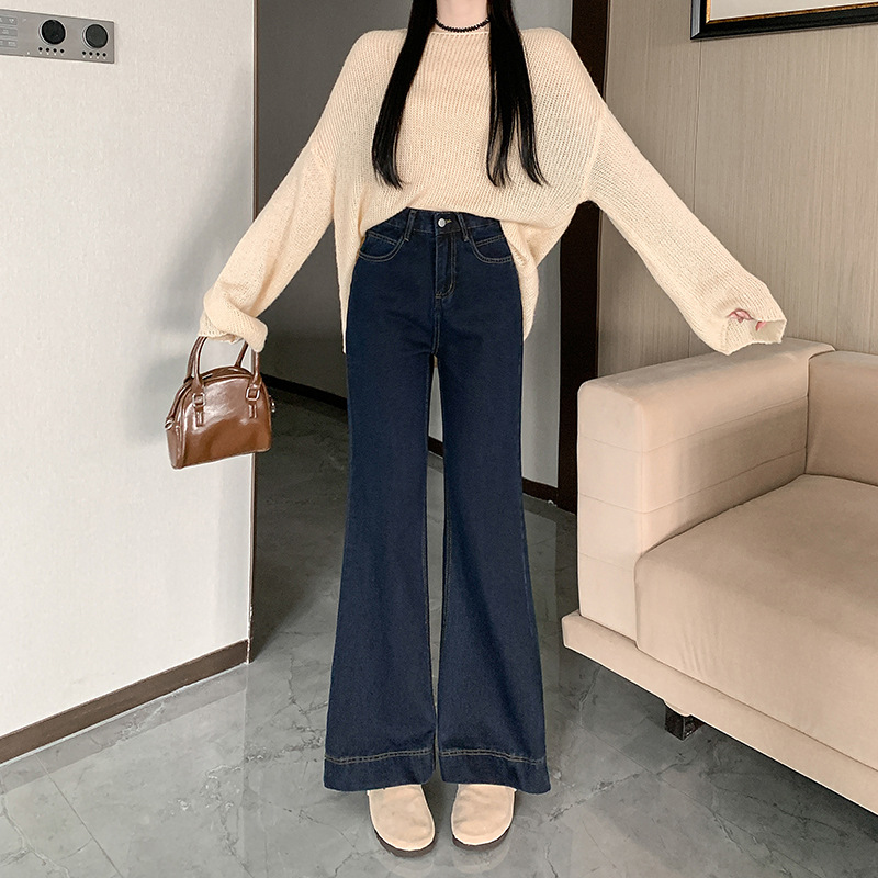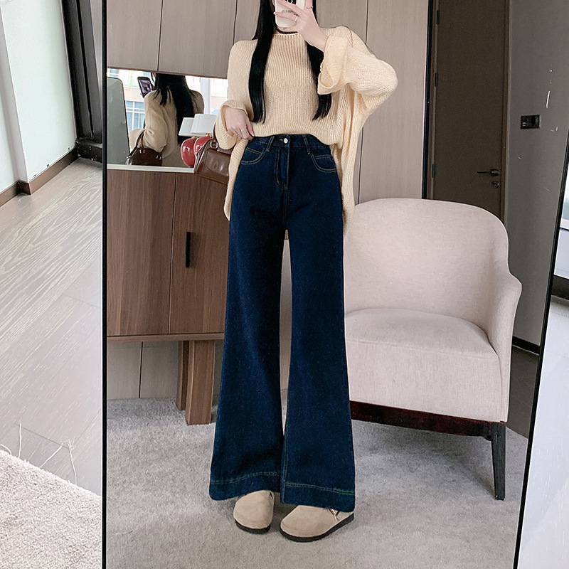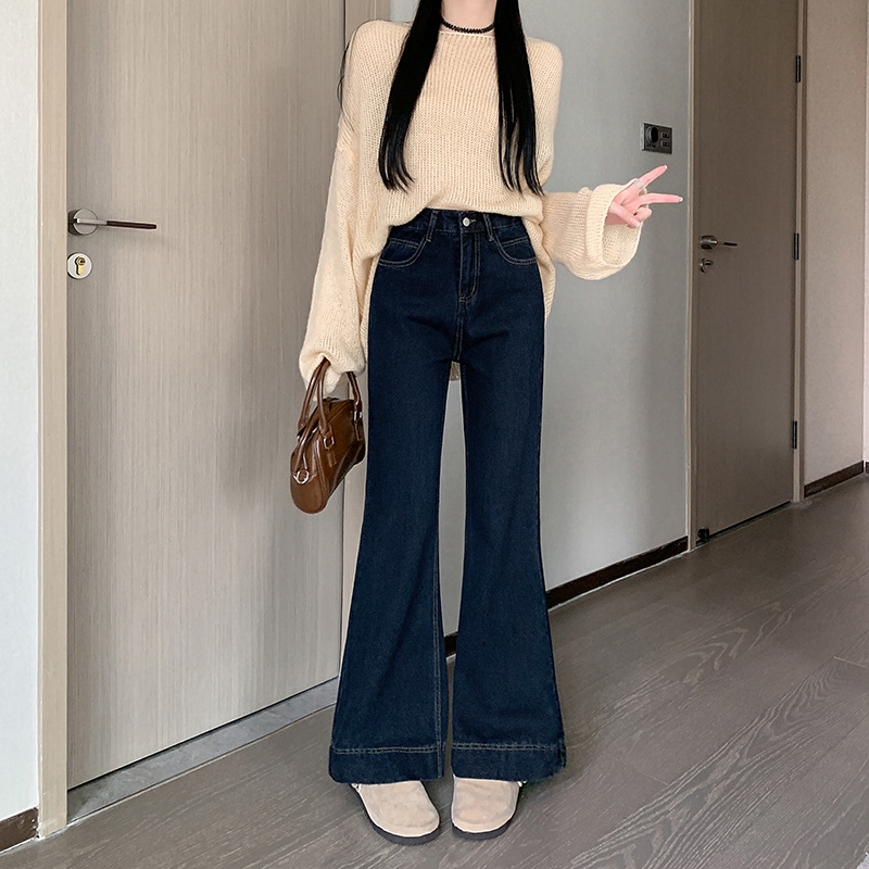 实拍实价~深蓝色微喇牛仔裤女秋冬季新款高腰马蹄牛仔喇叭裤