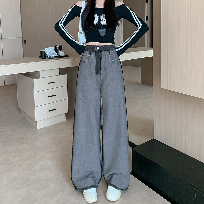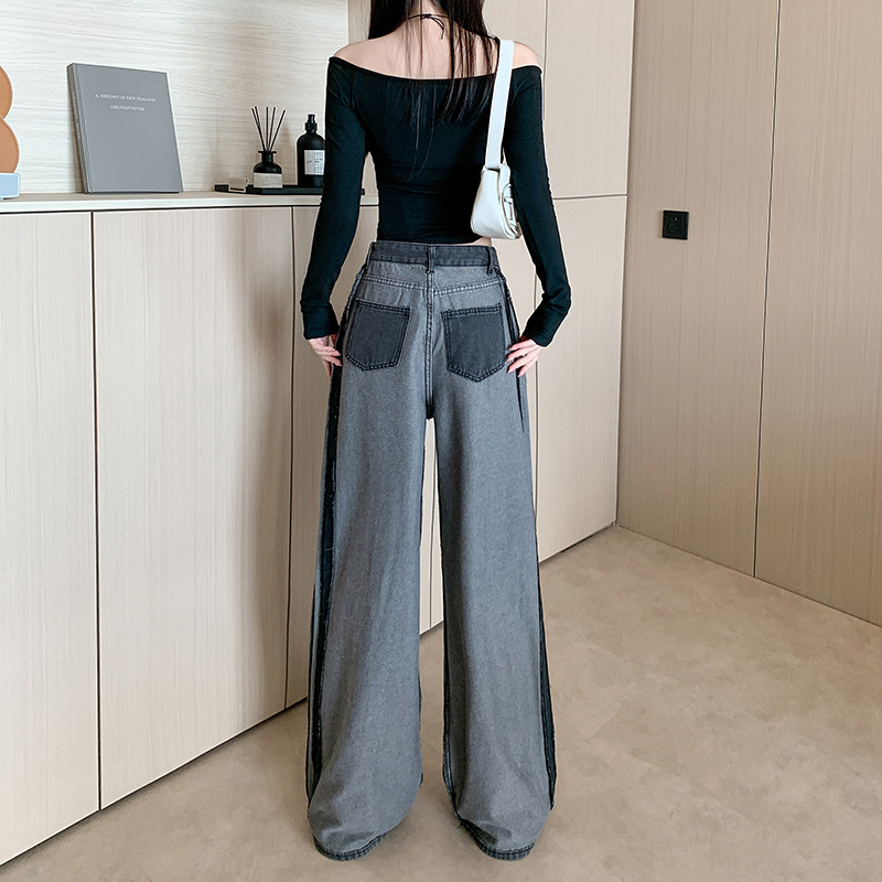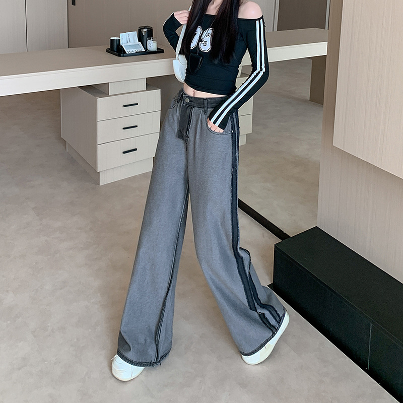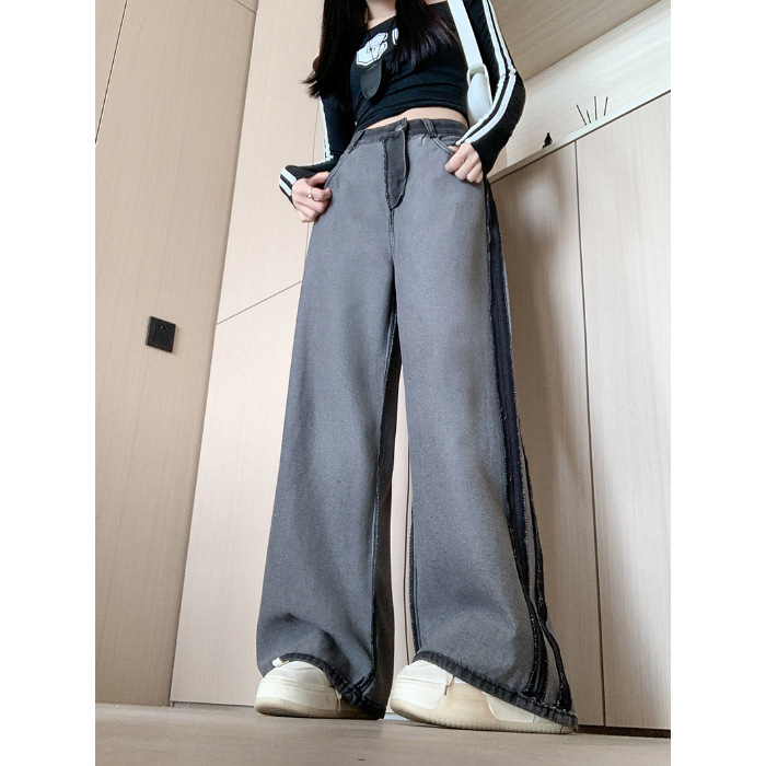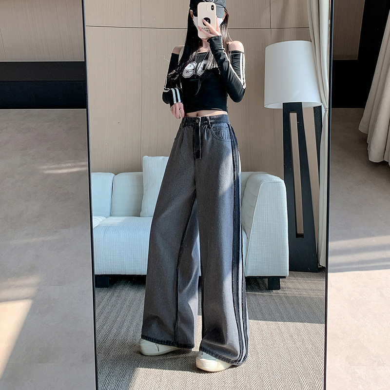 实拍实价~复古设计侧条纹拼色阔腿牛仔裤女新款宽松直筒拖地长裤