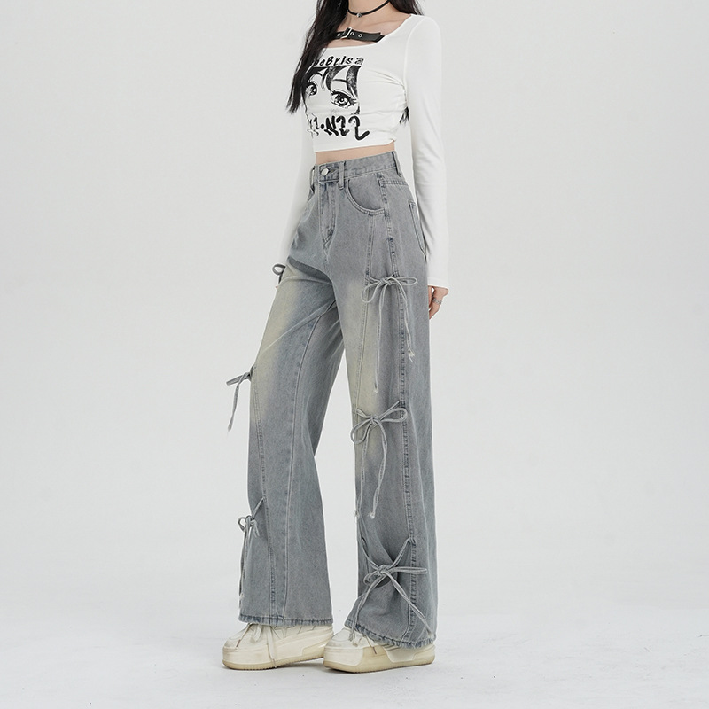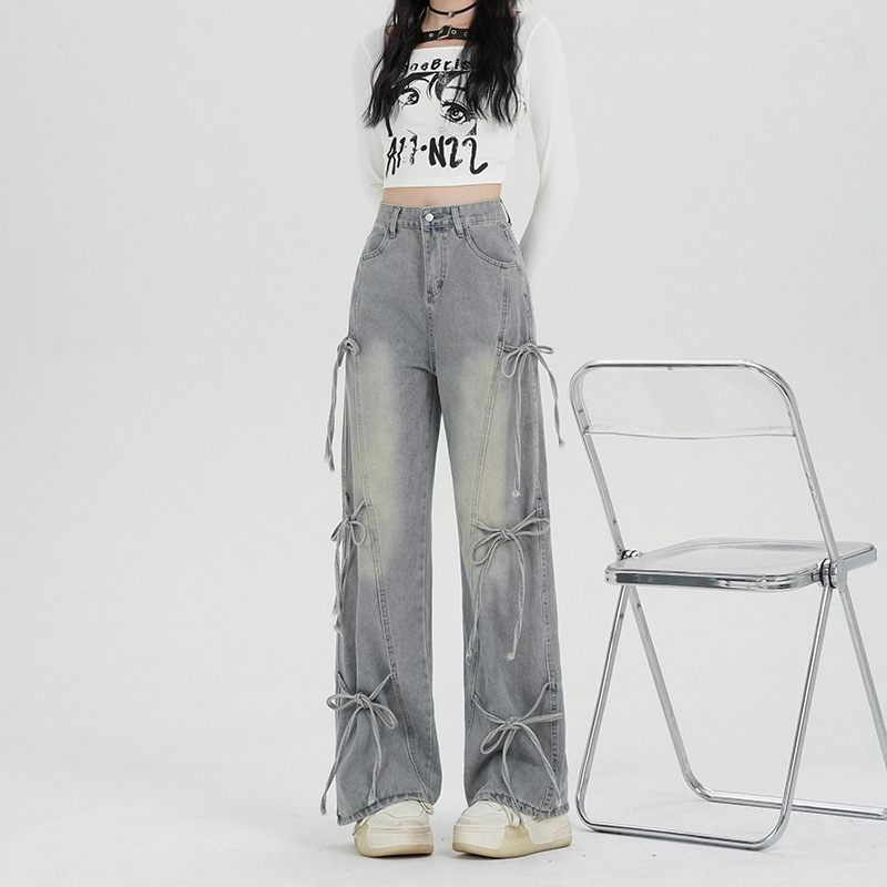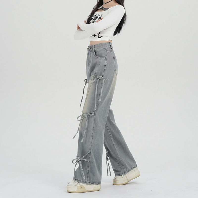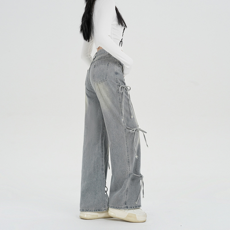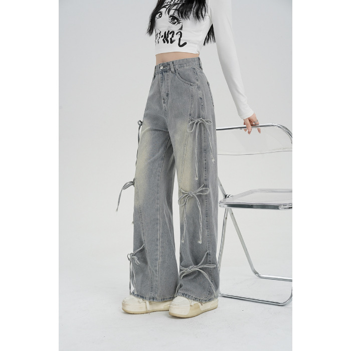 实拍实价~复古蝴蝶结绑带高腰阔腿牛仔裤女设计感宽松直筒长裤子