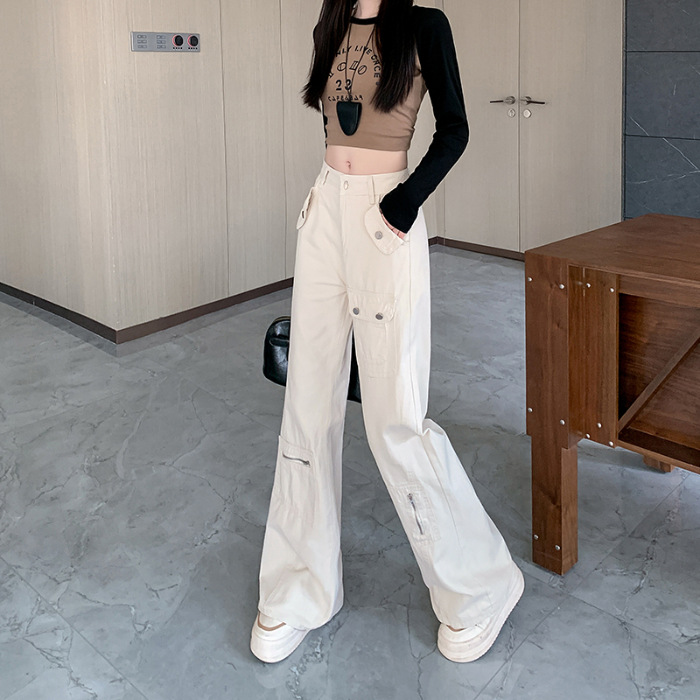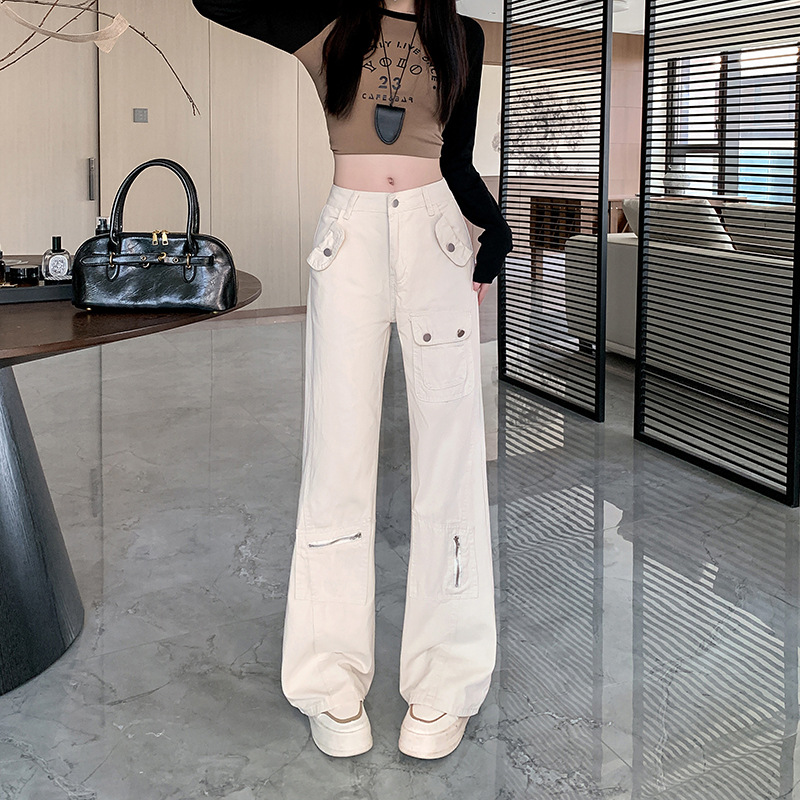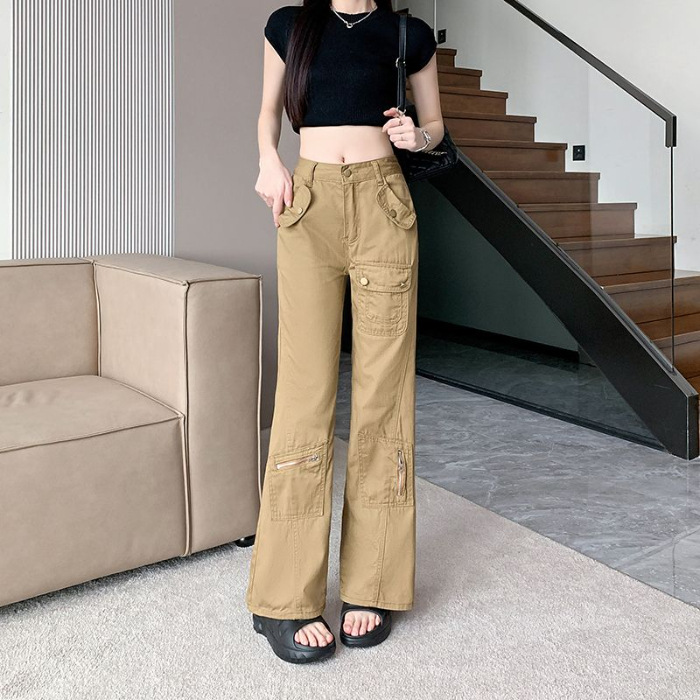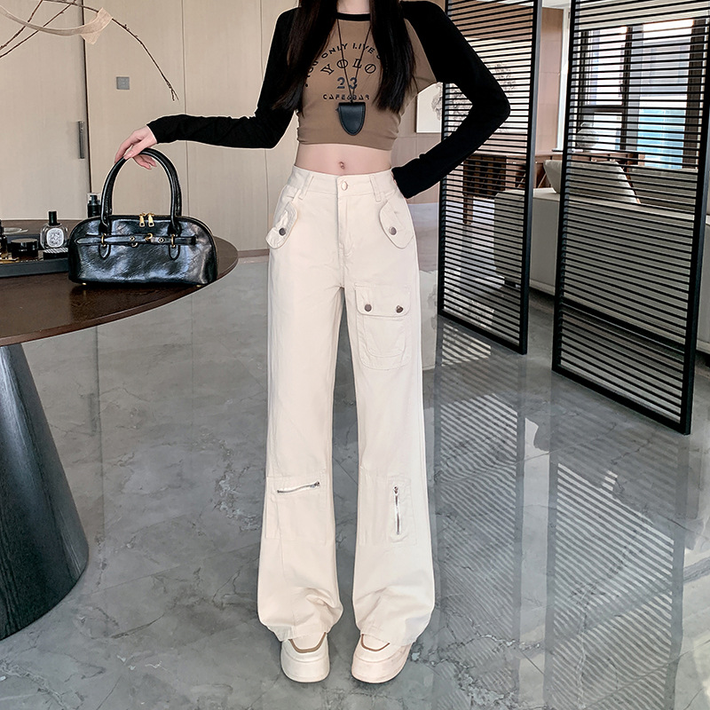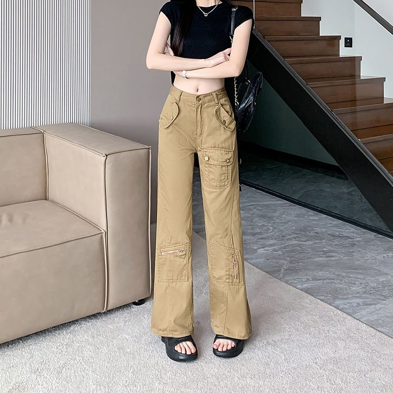 实拍实价~美式微喇裤工装女春季新款高腰显瘦多口袋拖地喇叭裤潮