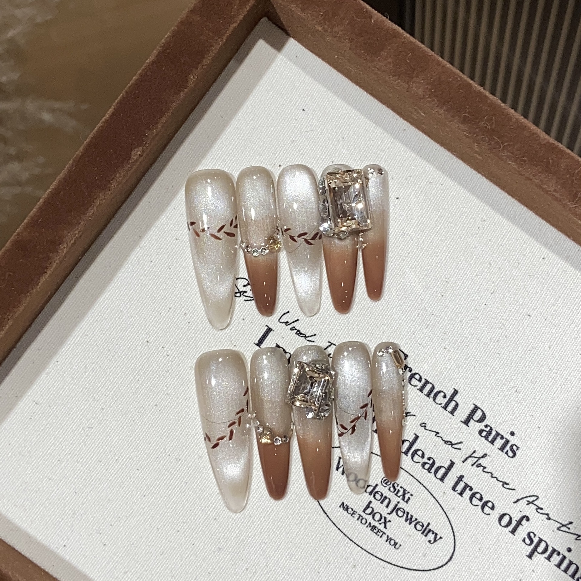 一只顾美甲 高级贵气感玻璃珠猫眼咖色渐变手绘叶片心事穿戴甲