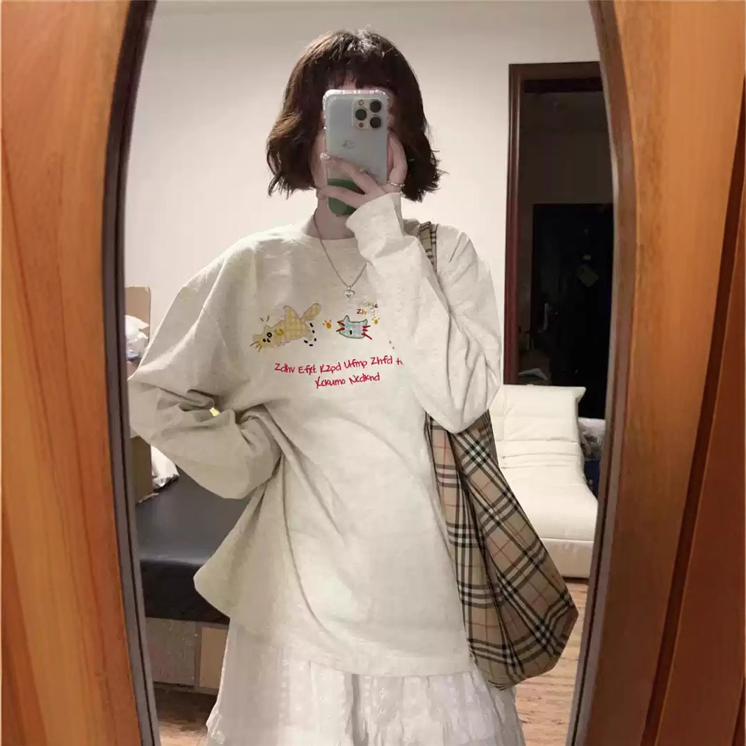 春秋纯棉长袖t恤女新款爆款早秋chic上衣灰色宽松内搭打底衫