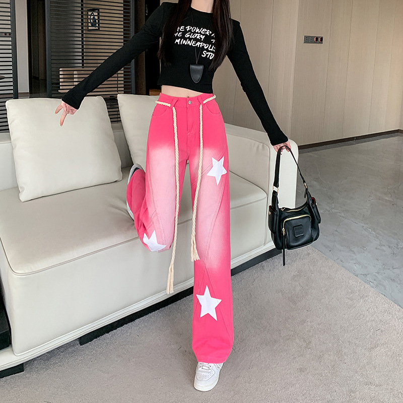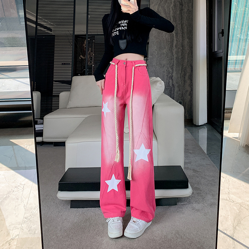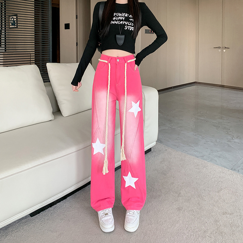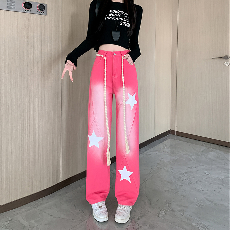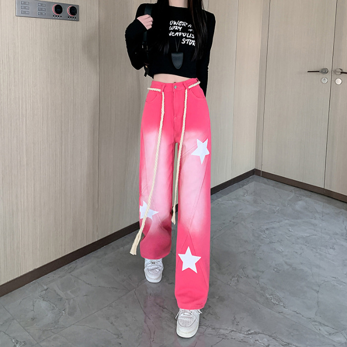 实拍实价~多巴胺穿搭粉色星星牛仔裤女高街辣妹宽松直筒阔腿裤子