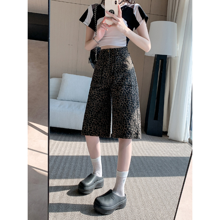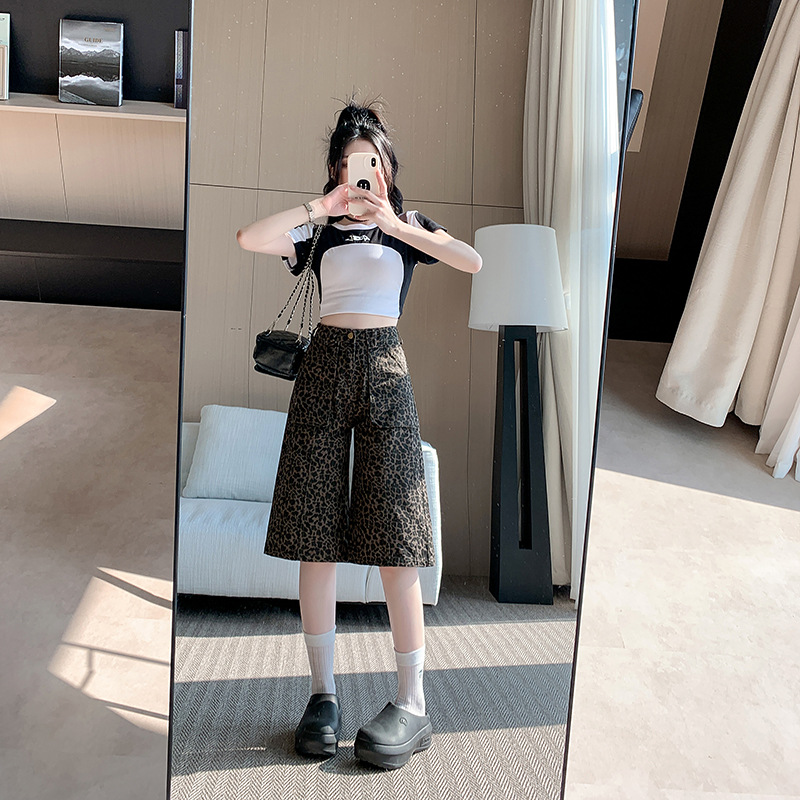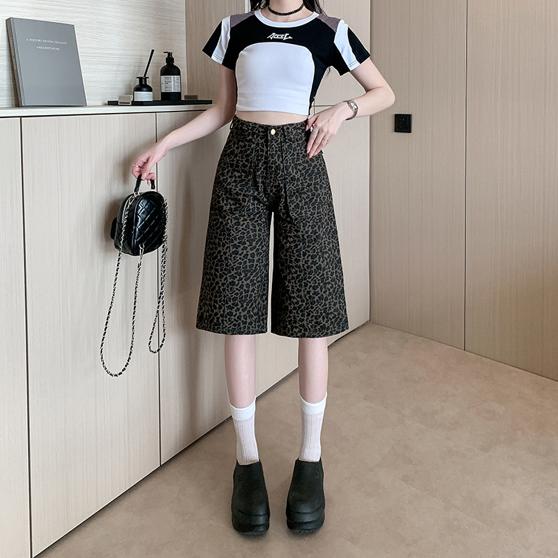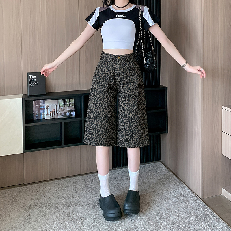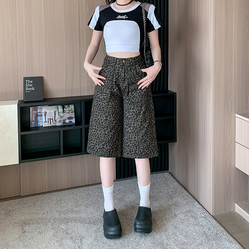 实拍实价~美式复古豹纹五分短裤女夏新款设计感辣妹阔腿七分中裤