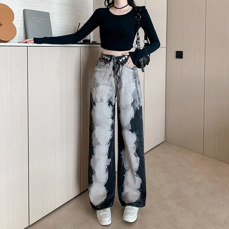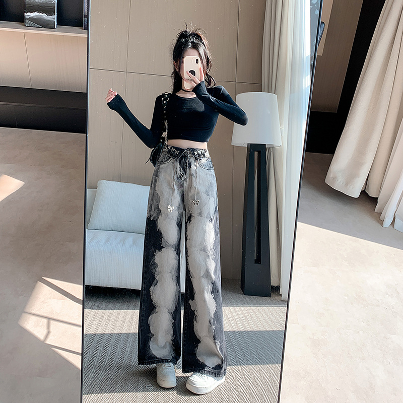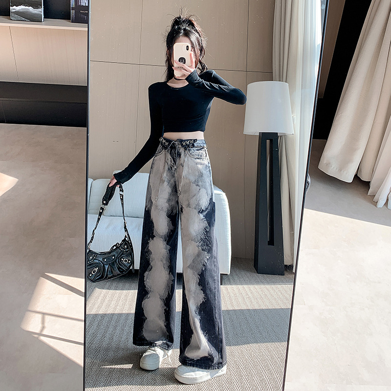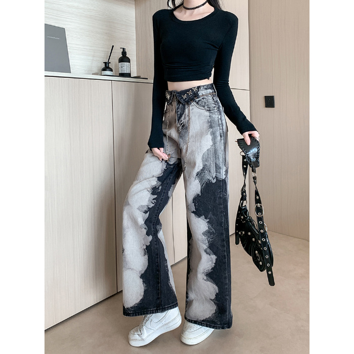 实拍实价~墨染撞色阔腿牛仔裤女春秋季新款高腰宽松直筒牛仔裤子