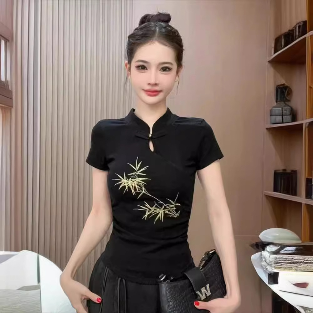 新中式女装夏季黑色立领镂空重工刺绣短袖T恤设计感国风盘扣上衣