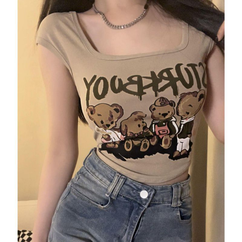 小熊印花辣妹背心女设计感百搭露背带胸垫修身打底美背短上衣夏季