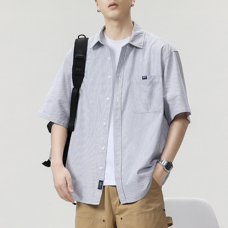 夏季新款薄款纯棉男士条纹短袖衬衫2025宽松男款休闲polo半袖衬衣