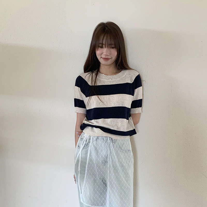 韩系百搭撞色条纹短袖t恤女显瘦圆领上衣