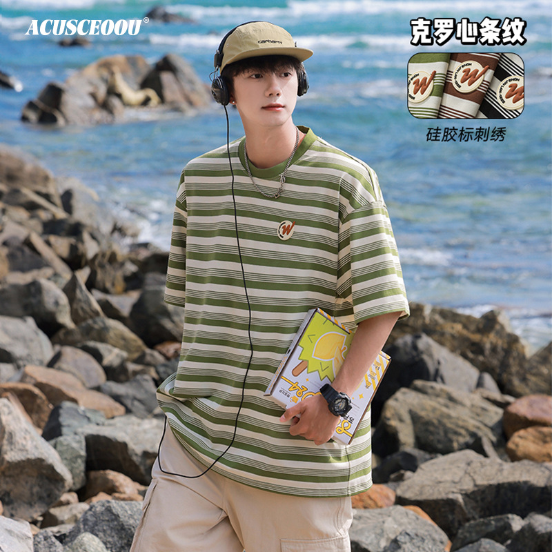 条纹t恤男夏季新品美式潮牌圆领半袖宽松休闲短袖tee