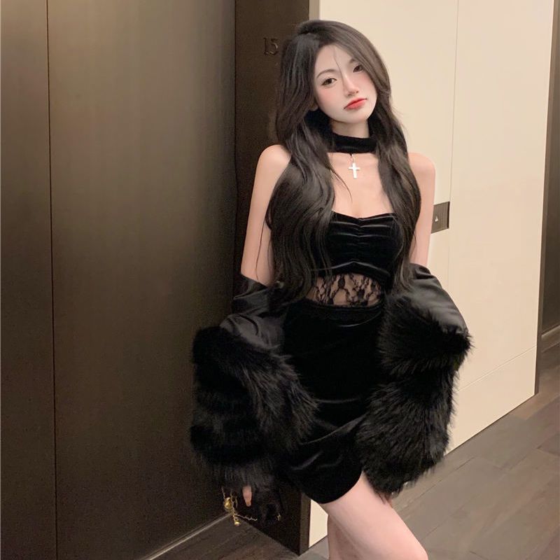 纯欲辣妹连衣裙挂脖设计感蕾丝拼接丝绒吊带裙女春季黑色包臀短裙