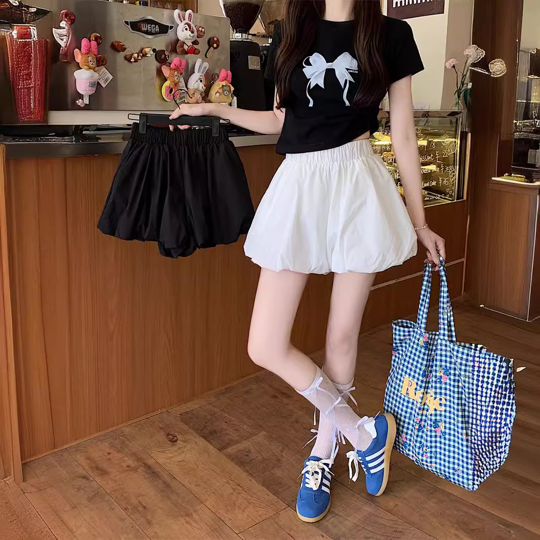 设计感花苞裙裤百搭休闲裤女夏季甜美风短裤松紧腰阔腿裤白色裤子