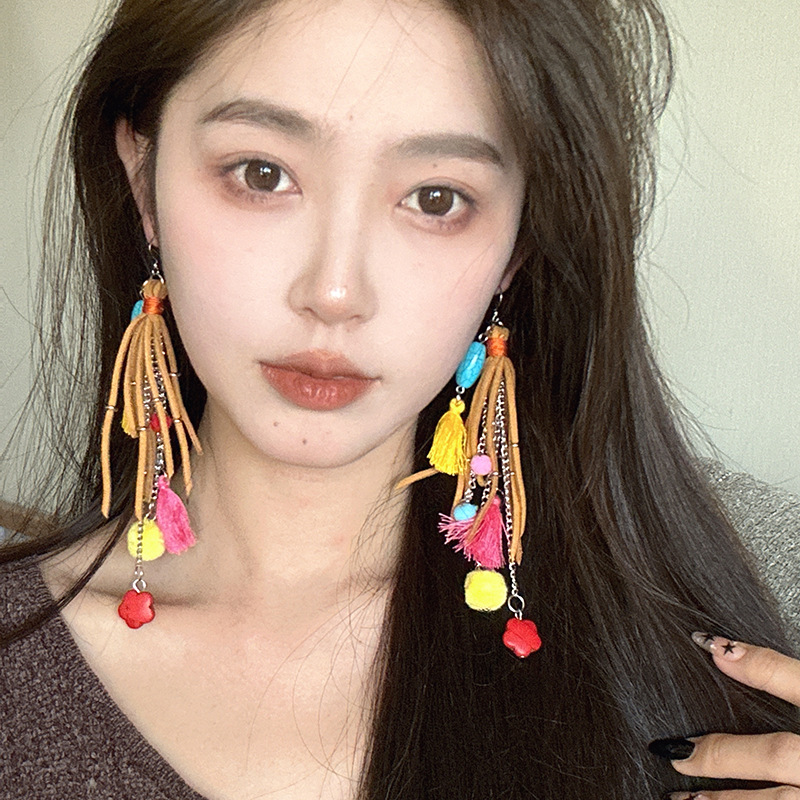 个性民族风彩色流苏皮绳耳环波西米亚毛球耳坠复古度假出游耳饰女