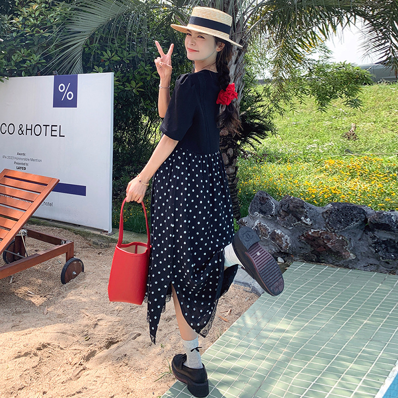 法式甜美假两件波点连衣裙夏清新减龄撞色圆领宽松蕾丝拼接少女裙