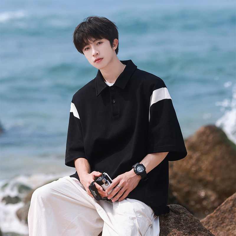 polo衫男夏季新款日系男装潮牌拼色宽松半袖体恤衫男士短袖T恤衫