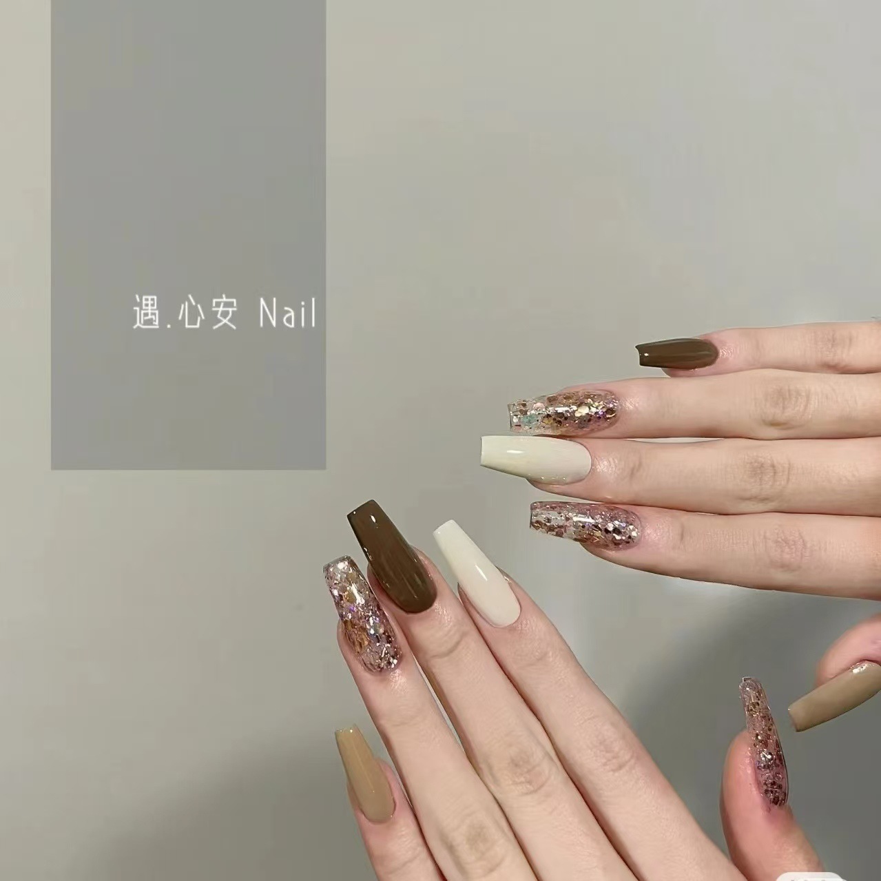 手工穿戴甲成品棕色跳色闪钻秋冬显白百搭气质氛围感亮片穿戴美甲