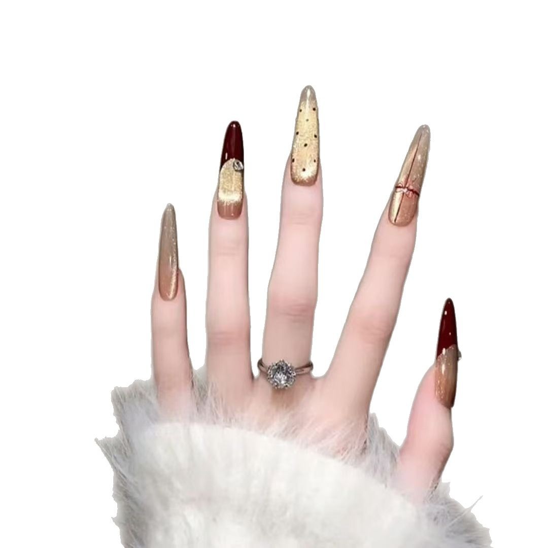 手工穿戴甲新年红色法式波点甲片蝴蝶结气质高级感金猫眼美甲贴