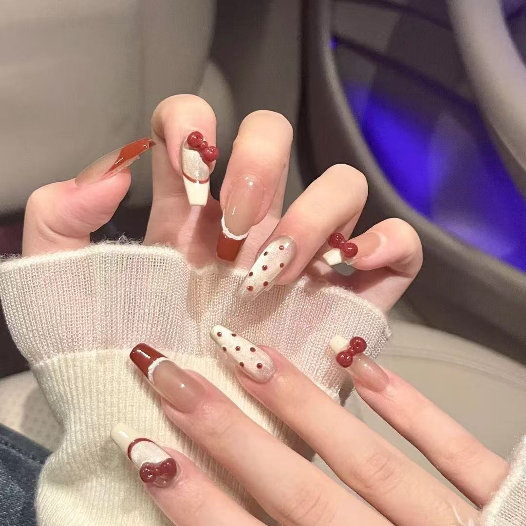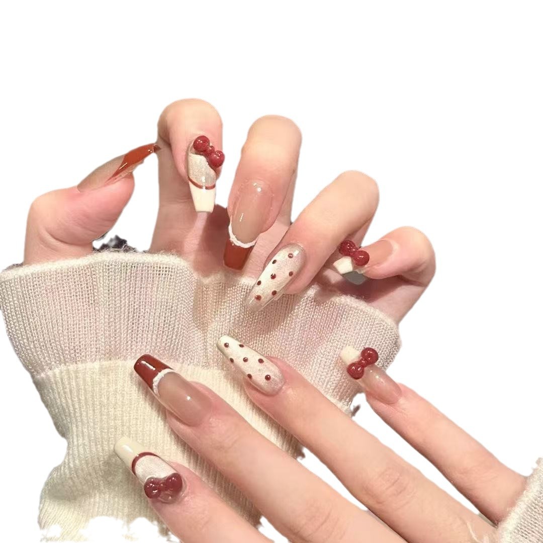 手工穿戴甲圣诞氛围感甜美蝴蝶结安可拉红法式少女心波点猫眼美甲