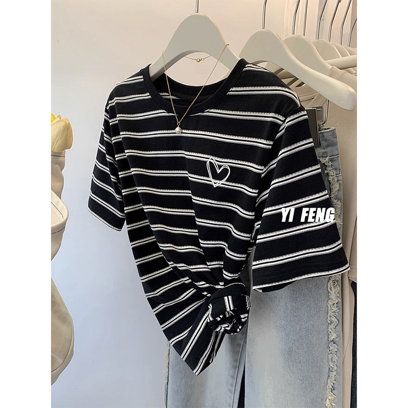 条纹爱心正肩短袖T恤女新款夏显瘦设计感小众宽松体恤上衣服