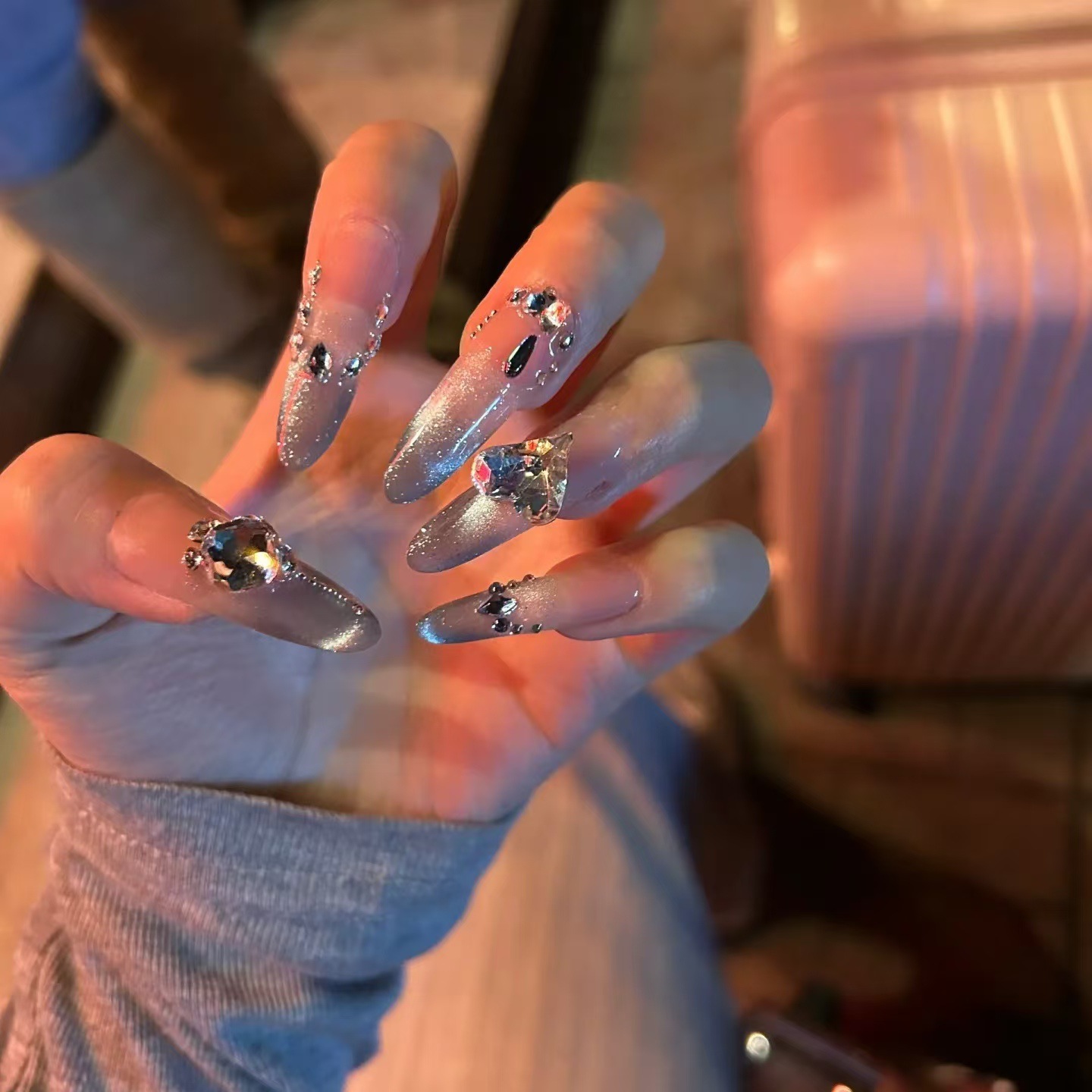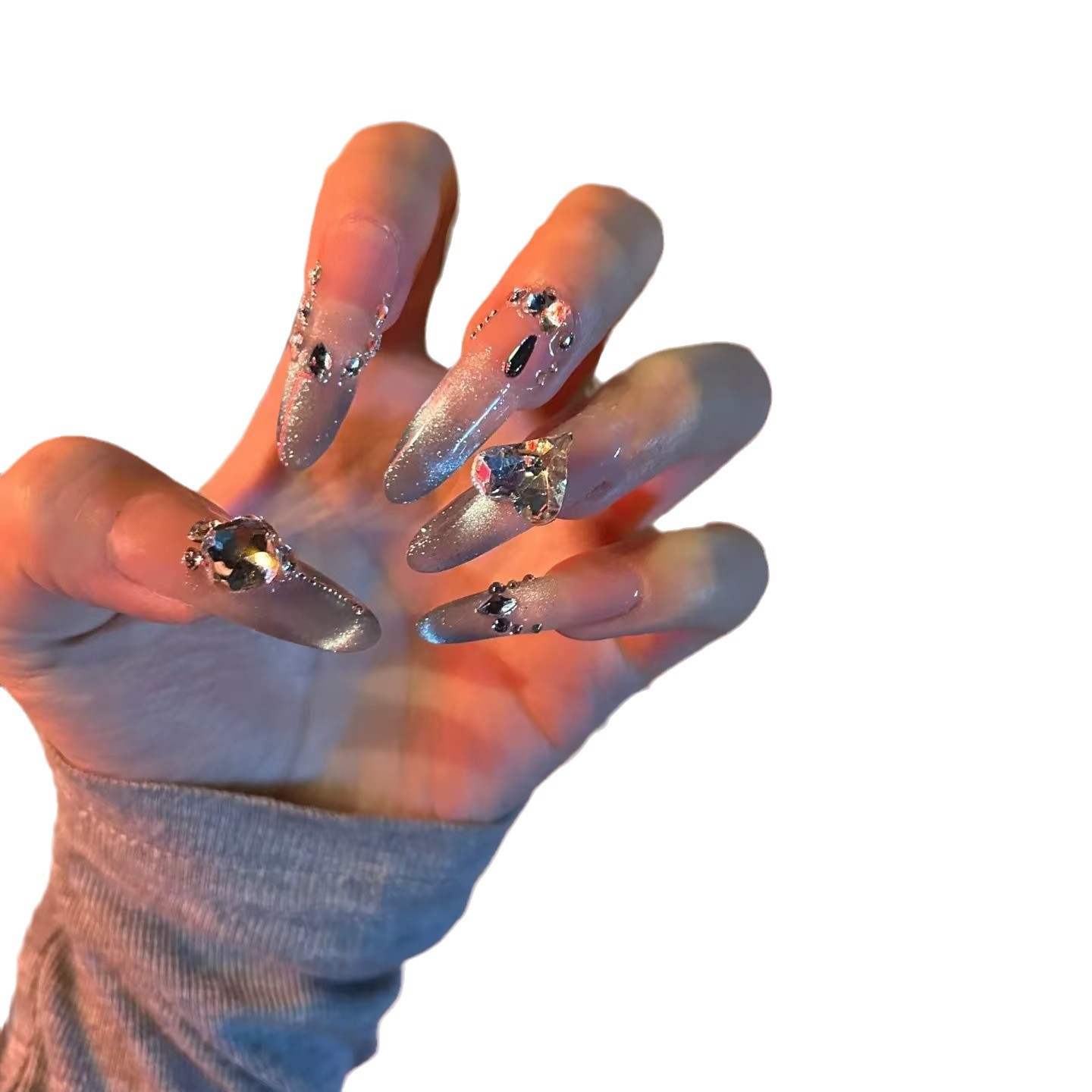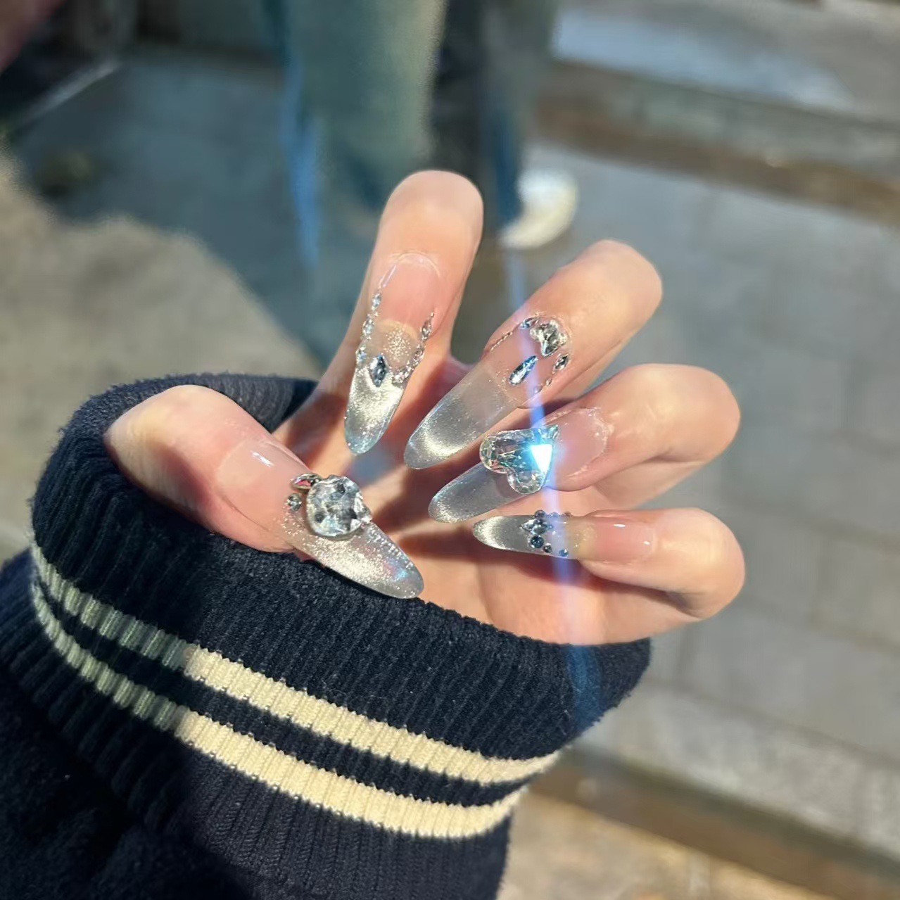 纯手工穿戴甲璀璨歪心钻浅蓝微笑法式猫眼气质轻奢高级感甜辣美甲
