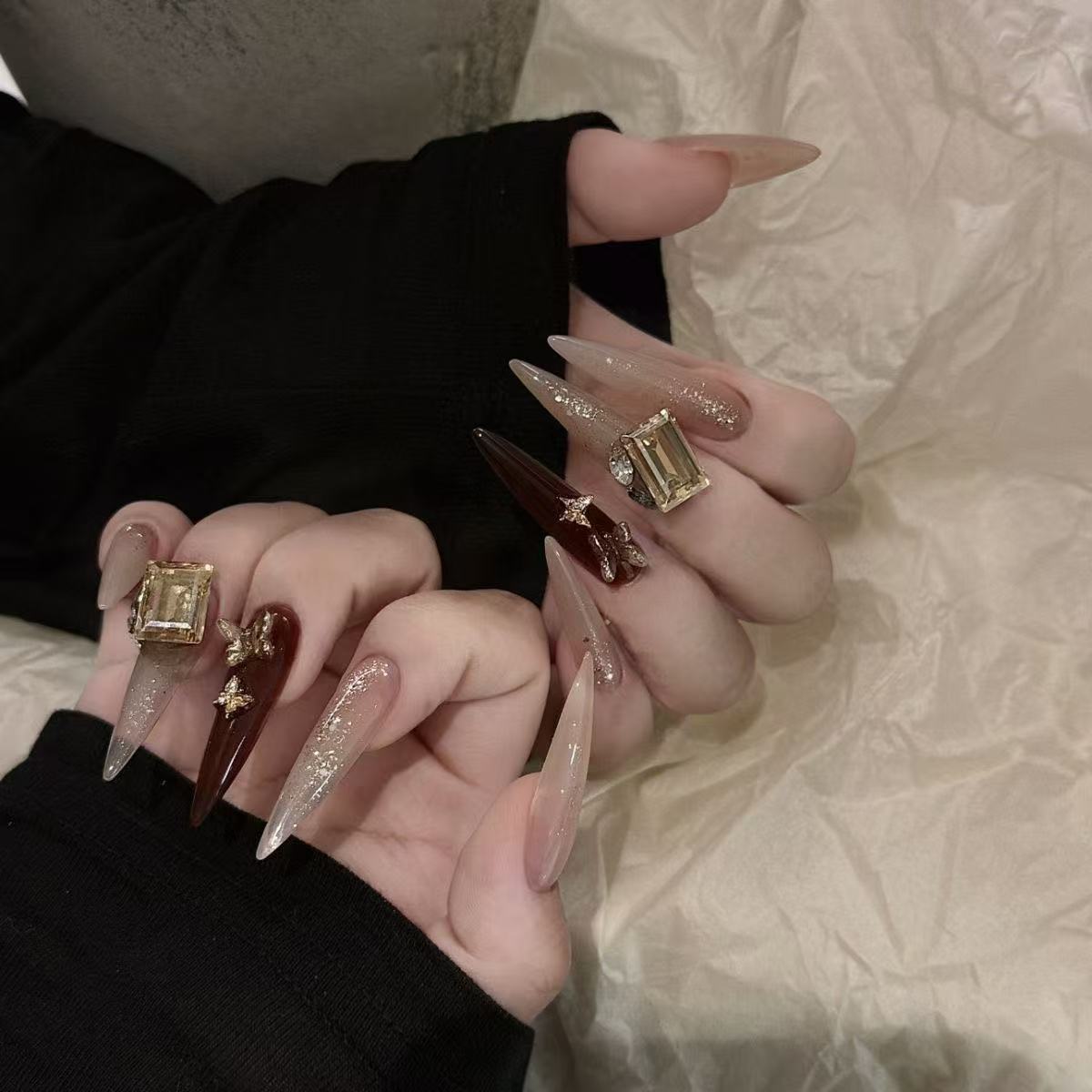 手工穿戴甲秋冬美拉德复古红甲片立体蝴蝶高级感氛围方钻气质美甲