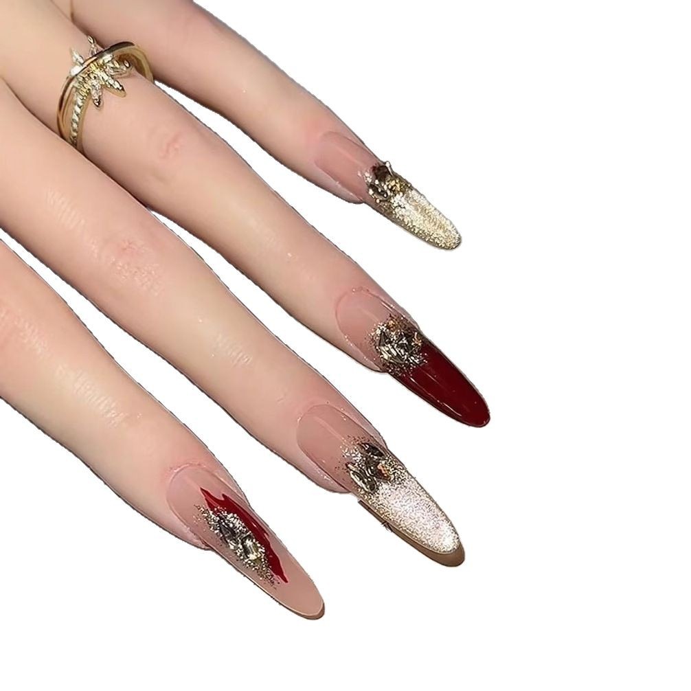 手工穿戴甲酒红新年香槟魔镜涂鸦甲片猫眼闪钻轻奢高级感显白美甲