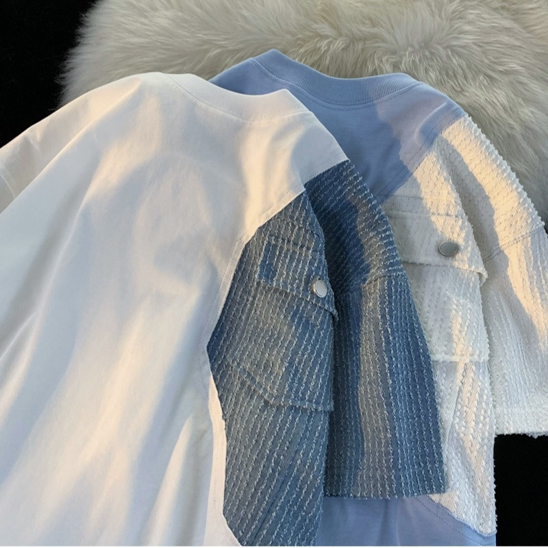 多巴胺撞色半分袖港风牛仔复古宽松ins韩夏季小众独特别致情侣装