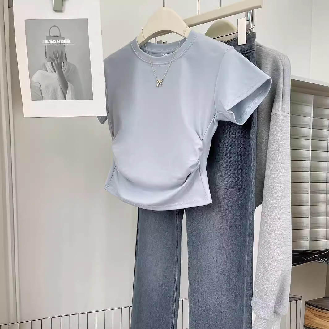小个子正肩短袖T恤女甜辣妹修身显瘦纯欲风不规则褶皱短款小衫夏