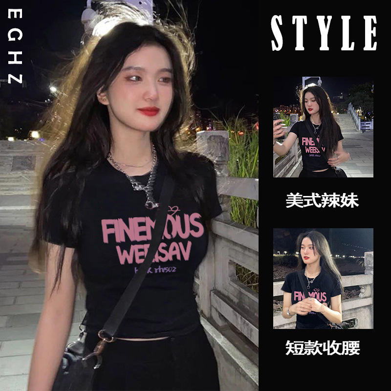 美式复古黑色纯棉短袖t恤女夏设计感小众独特修身显瘦辣妹短上衣