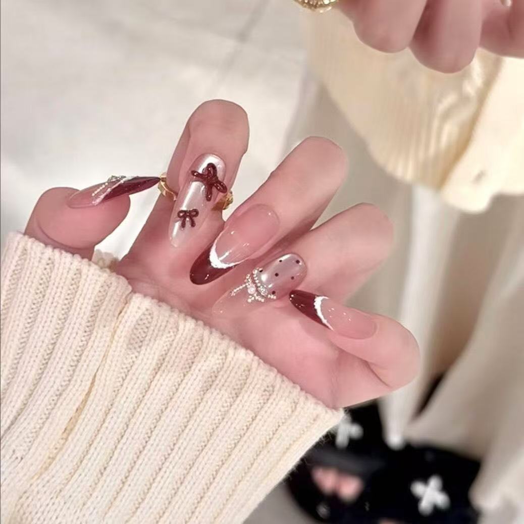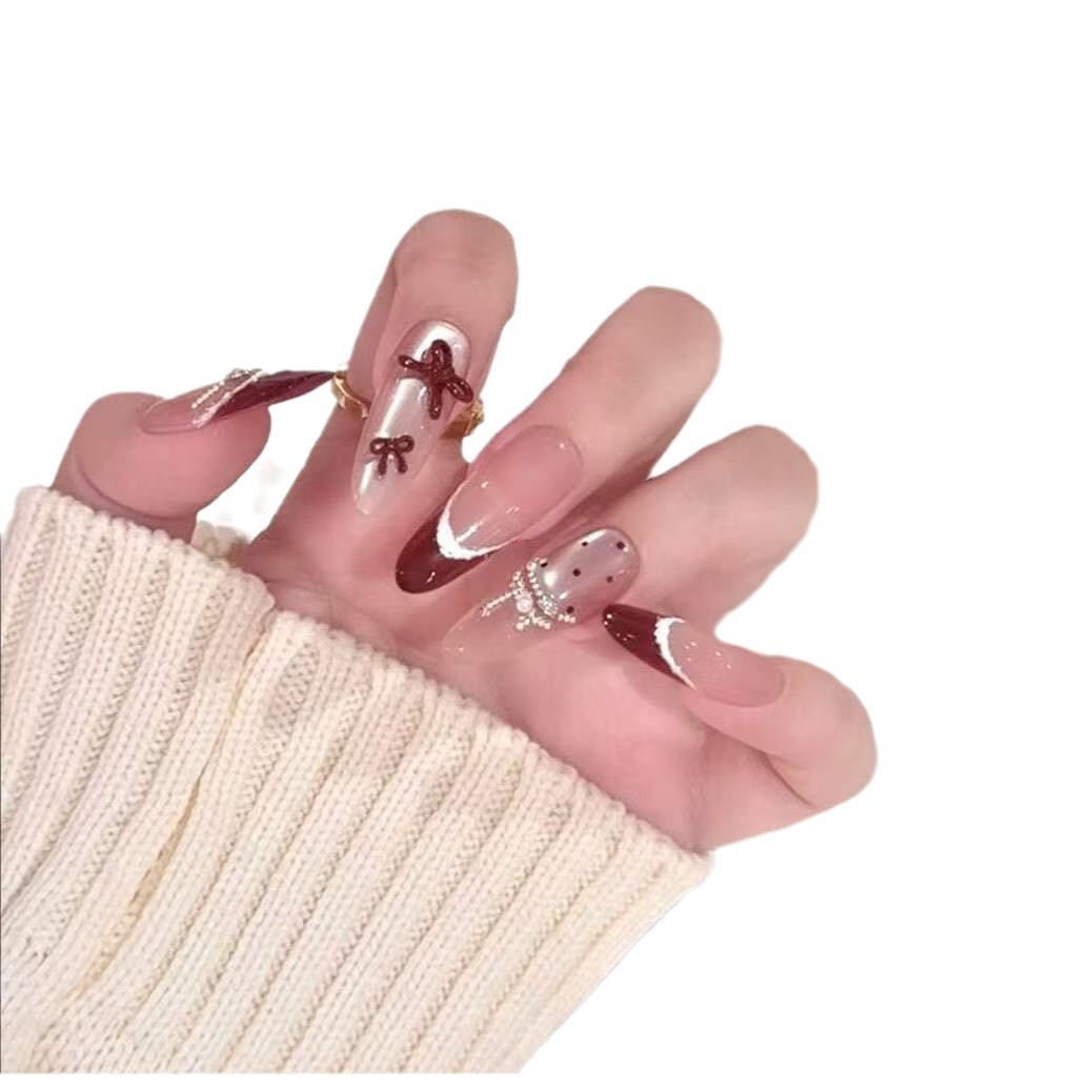 手工穿戴甲秋冬气质显白红色法式甲片波点蝴蝶结百搭圣诞新年美甲