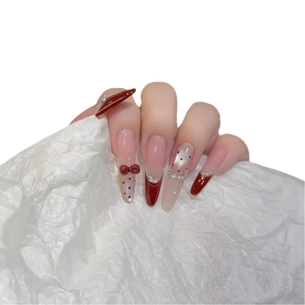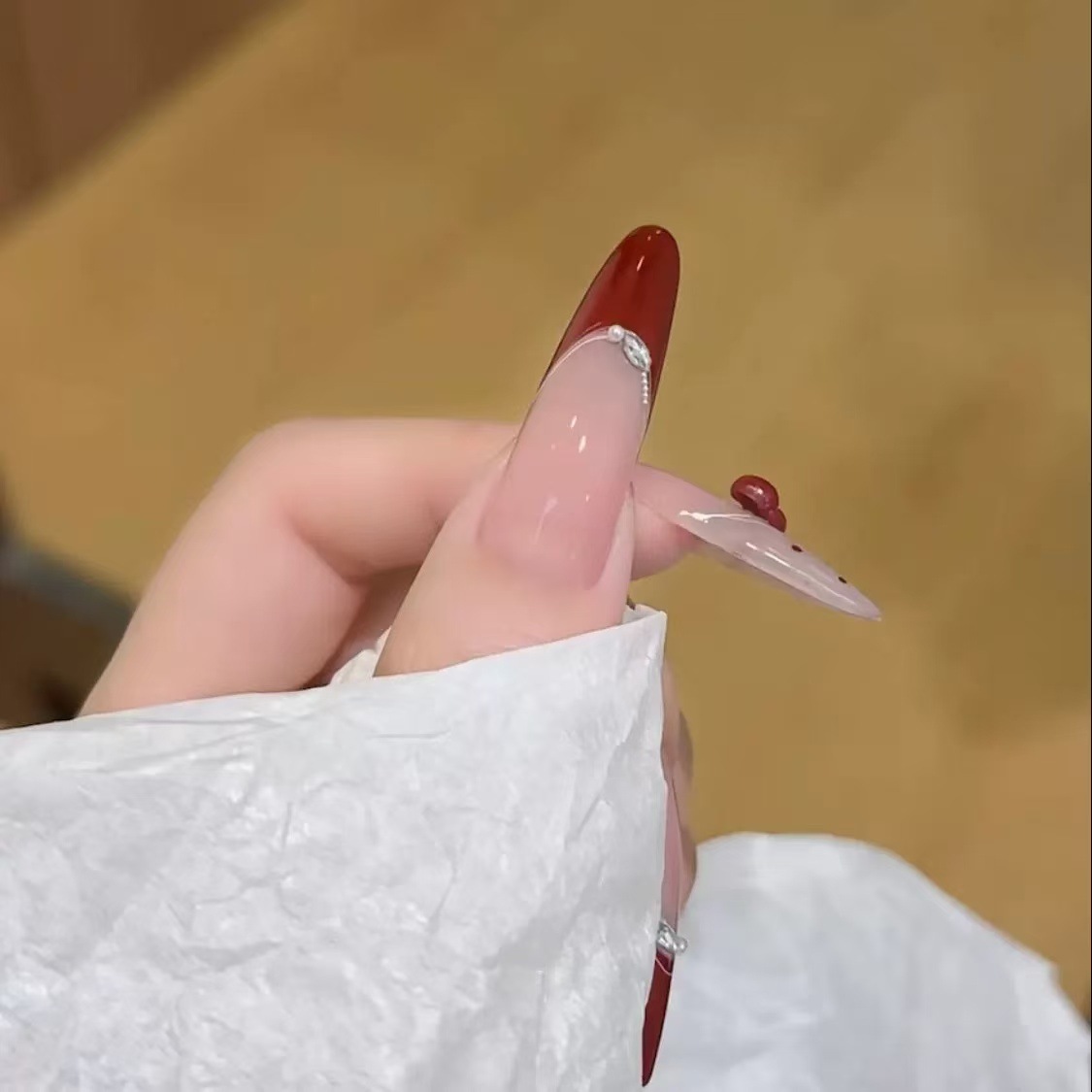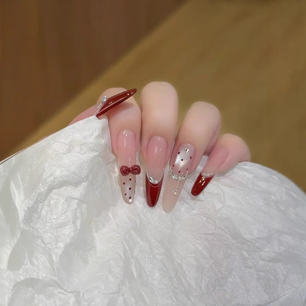 手工穿戴甲温柔甜美新年氛围感甲片酒红法式波点蝴蝶结猫眼美甲贴