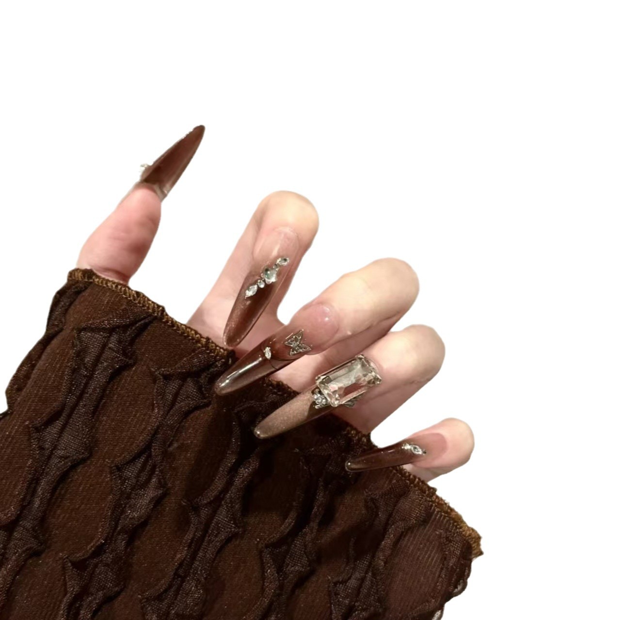 纯手工穿戴甲贵妇气质咖色方钻渐变斜边猫眼纯欲风显白美甲可拆卸