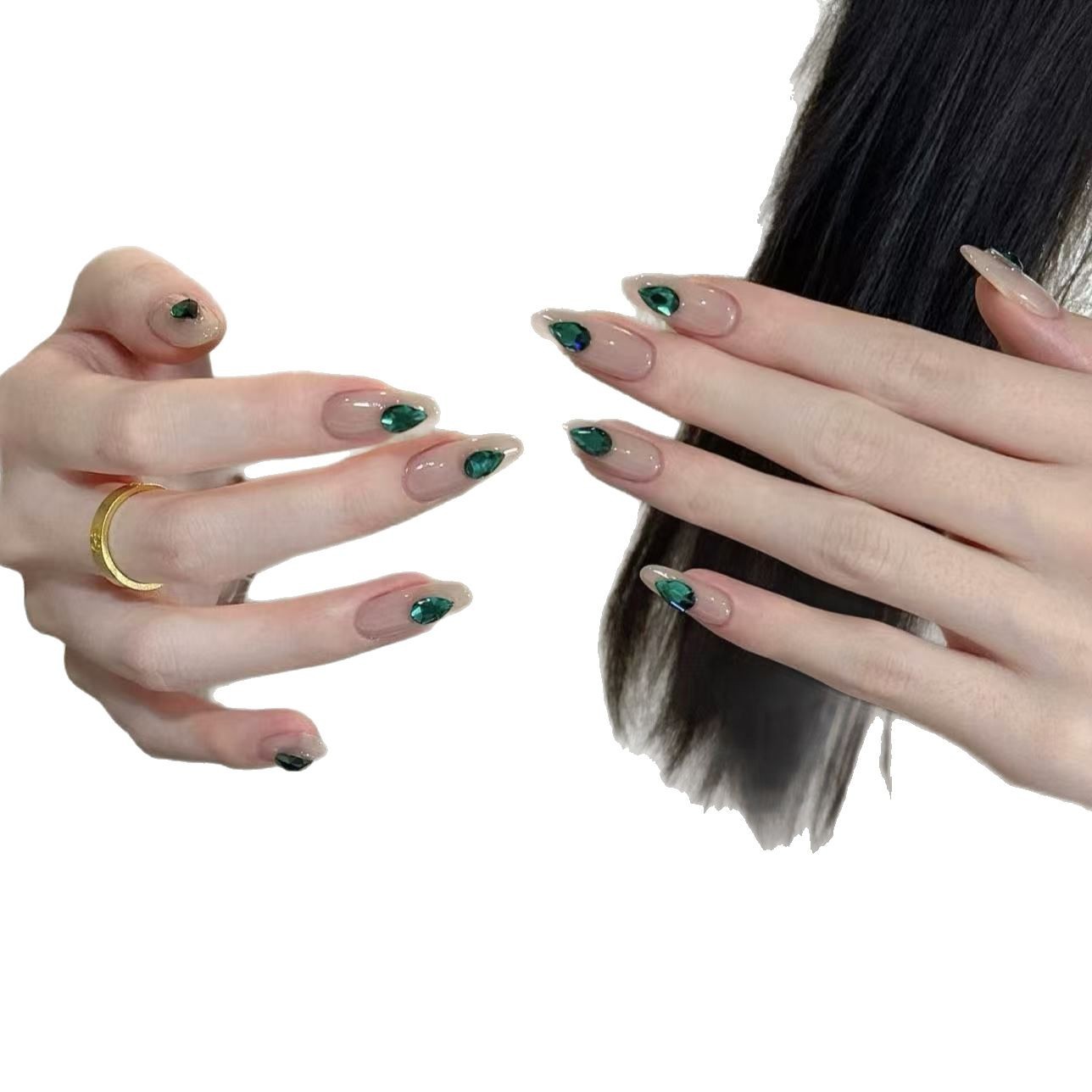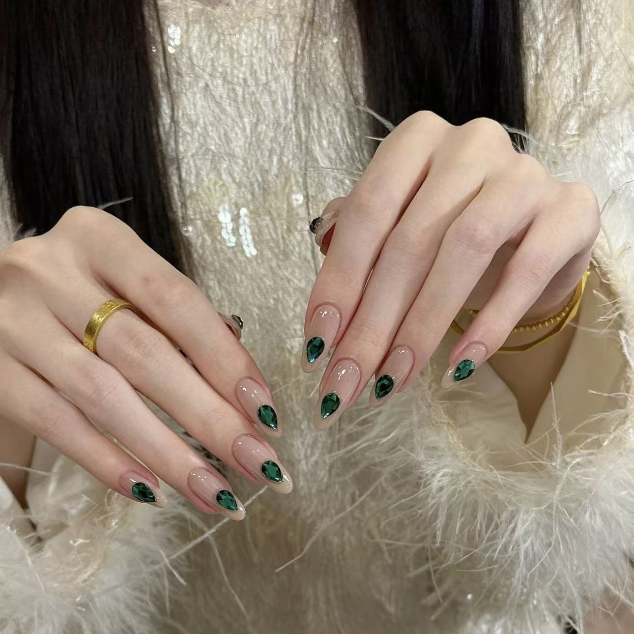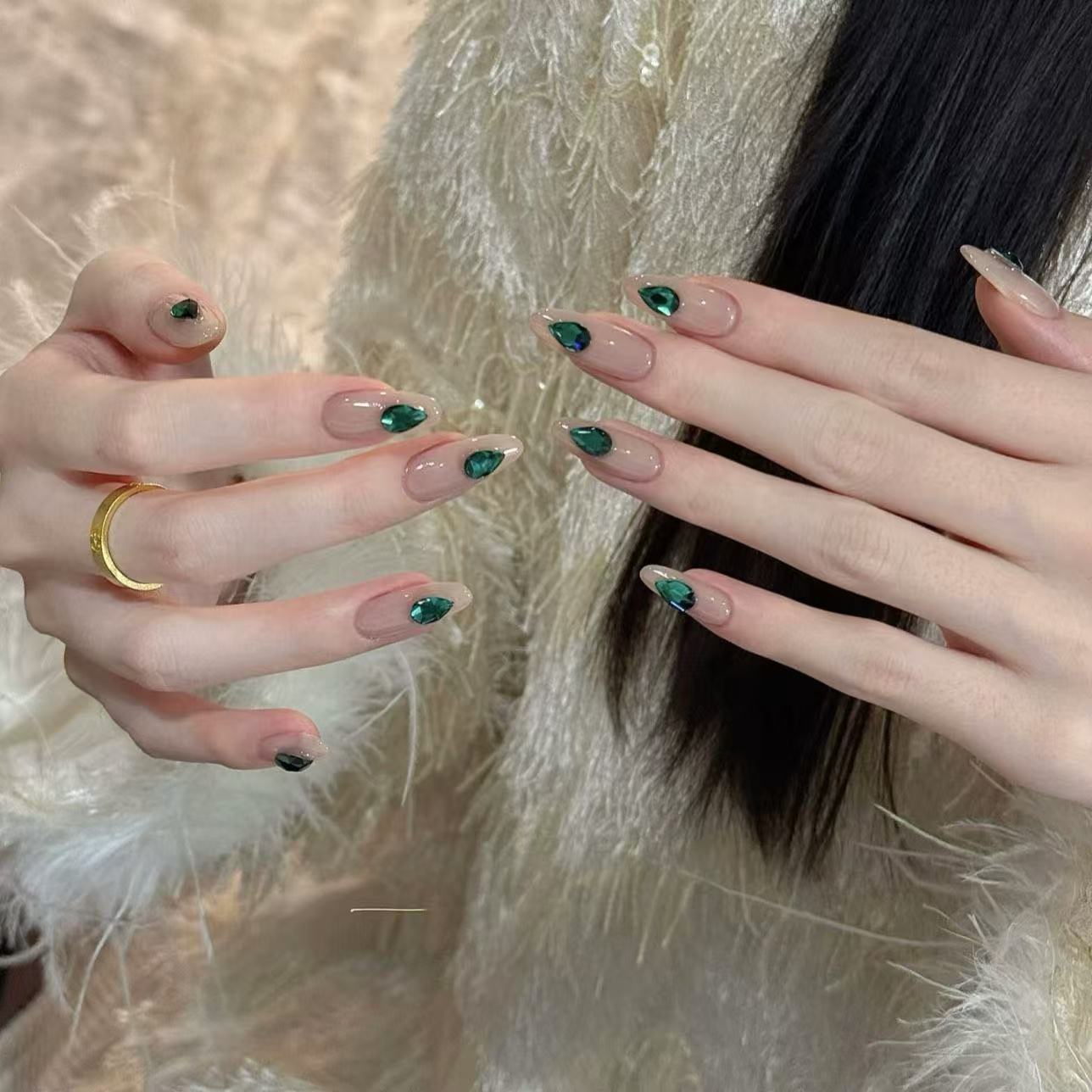 手工穿戴甲裸色气质高级感祖母绿甲片贵族千金奢华满钻纯欲风美甲