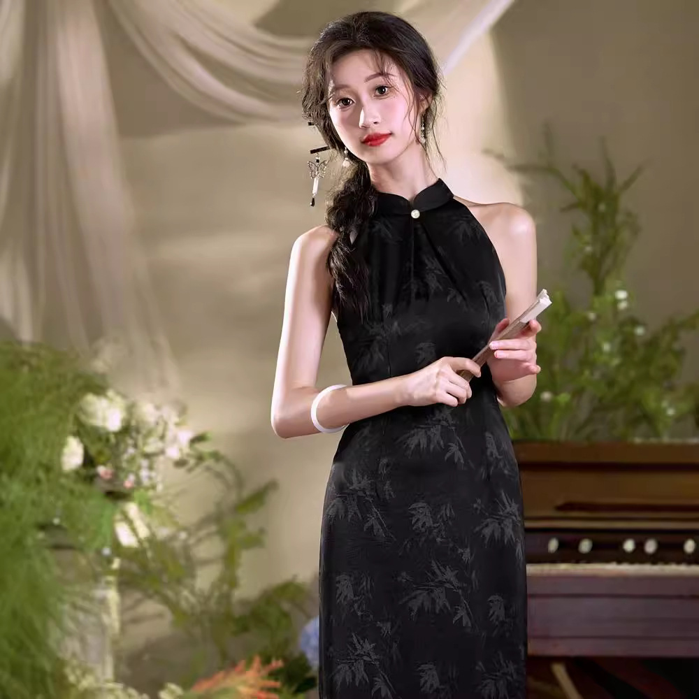 新中式复古改良旗袍无袖挂脖连衣裙女春夏季收腰显瘦裙子日常可穿