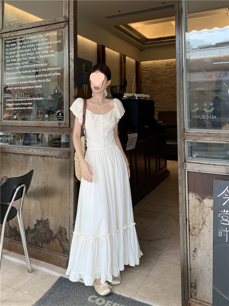 夏季新款女韩版修身方领短袖衬衫木耳边松紧腰中长款半身裙两件套