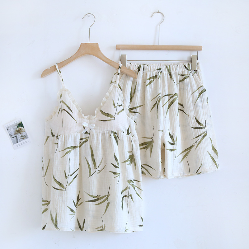 纯棉睡衣女夏季绉布吊带胸垫两件套装甜美可爱清新家居服可外穿