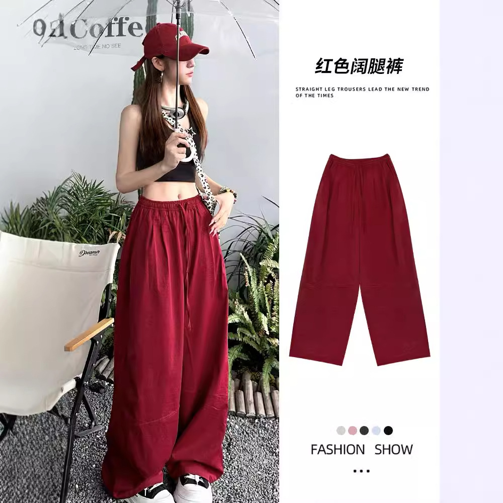 红色速干工装裤女春秋款高腰宽松显瘦休闲裤小个子慵懒直筒阔腿裤