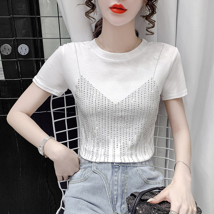 纯棉欧货重工烫钻短袖夏新款高腰短款假两件短袖小众别致上衣