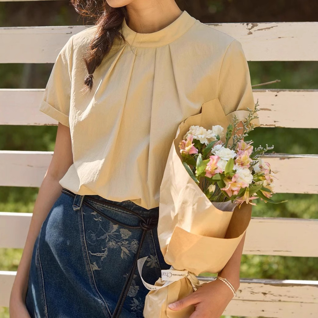 solihgter 法式莱赛尔绿色立领衬衫女夏季25新款短袖绑带上衣
