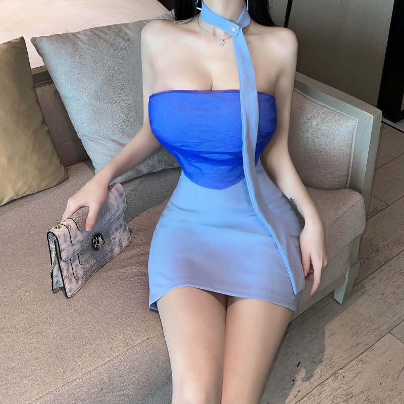 纯欲性感风名媛一字肩抹胸露背网纱拼接裹胸短裙紧身连衣裙女包臀