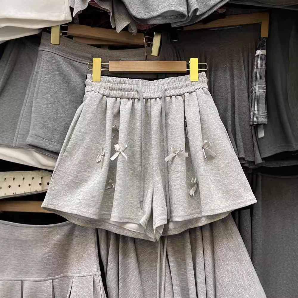 设计感立体蝴蝶结休闲裤女夏季小个子减龄直筒裤松紧腰阔腿短裤子