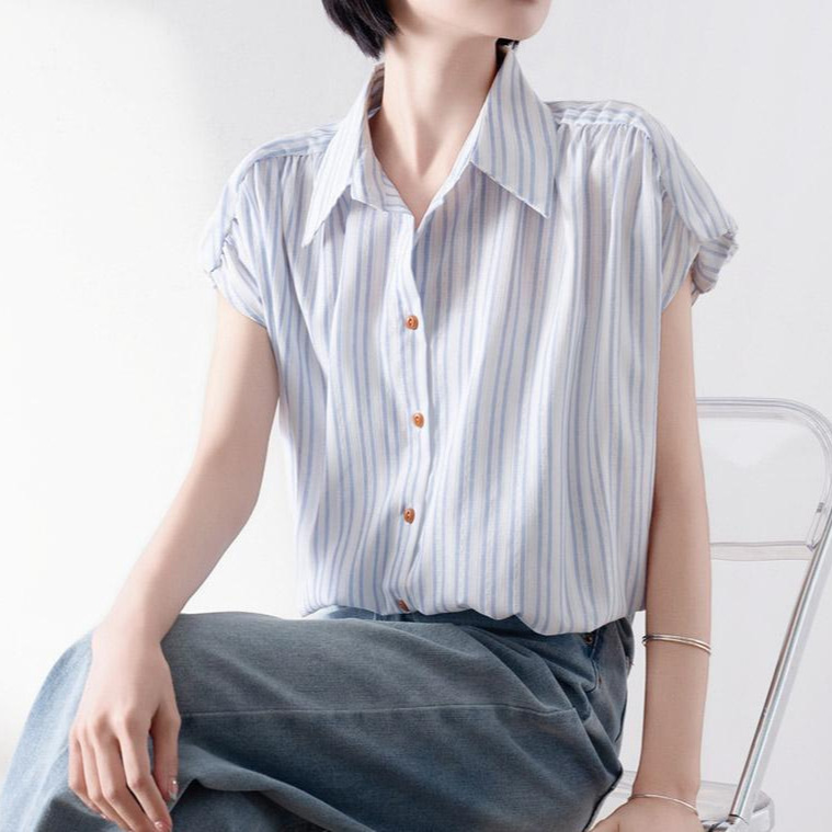 2025女夏季新款竖条纹衬衫设计感小众小飞袖上衣小个子短袖衬衣